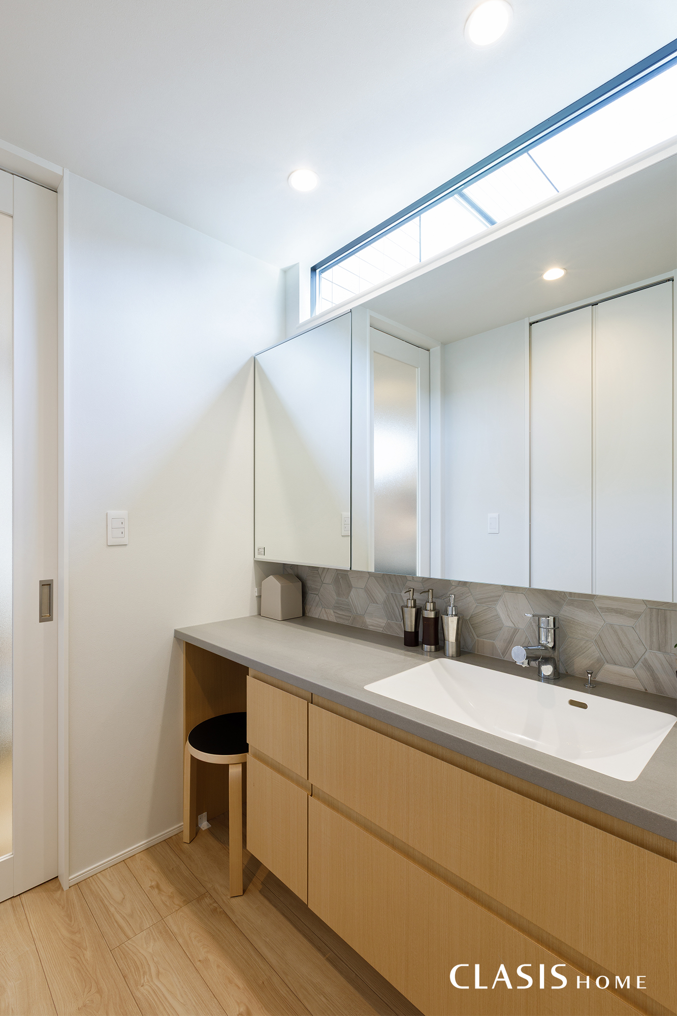 造作洗面台には、ゆったりと身支度の時間を過ごせるように椅子を収納できるスぺ―スを設けました。大きな一面鏡と機能的な収納付きミラーを組み合わせ、デザイン性と利便性を両立させています。上部の高窓から自然光が降り注ぐ、明るく清潔感あふれる空間です。