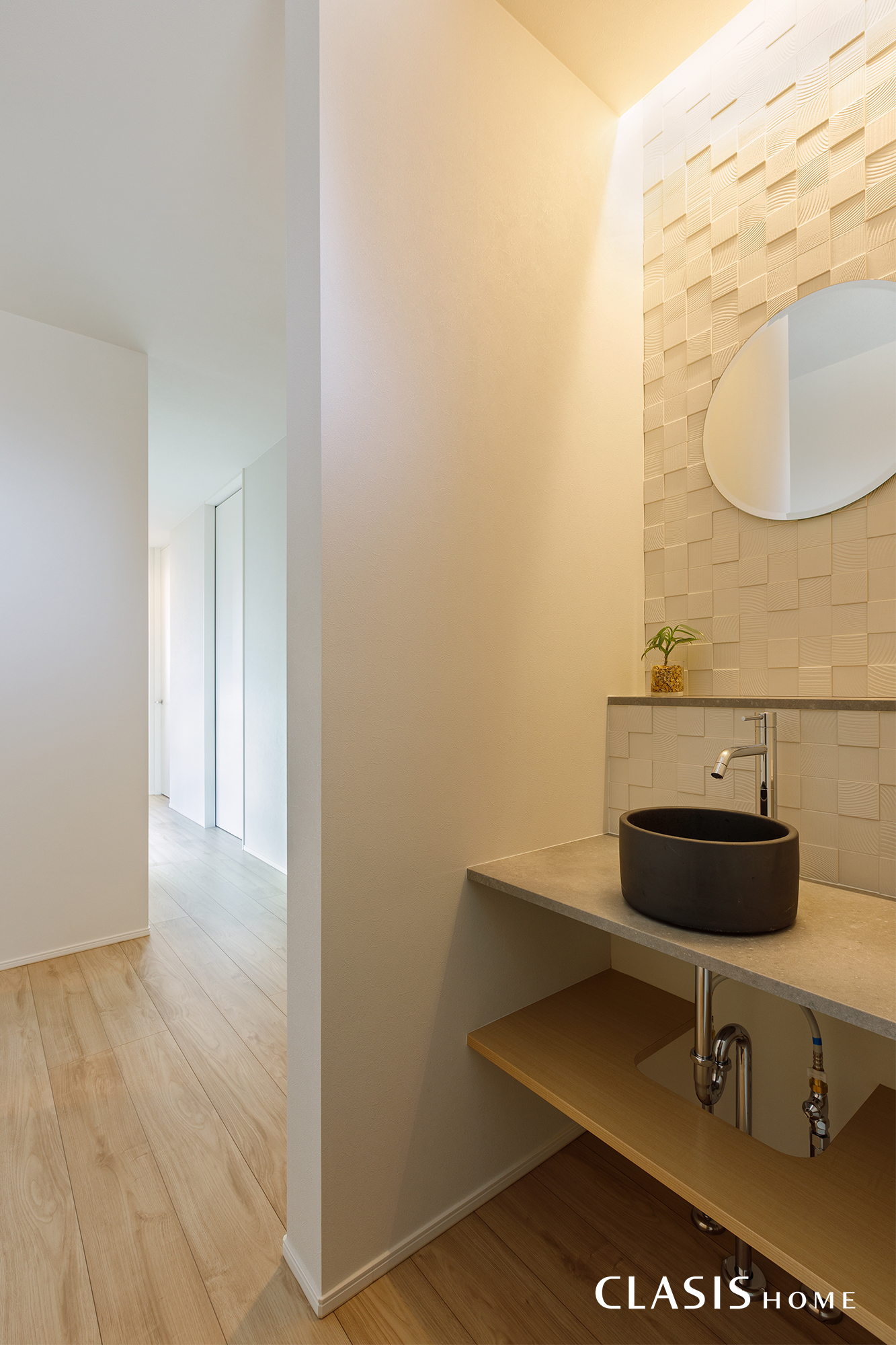 丸いミラーやマットな質感のボウルを組み合わせ、ギャラリーの一角のような雰囲気の造作手洗い。壁をふかしてカウンターを設けることで小物を置けるように設計しました。天井からの間接照明がタイルの凹凸を美しく照らし、より雰囲気を高めています。