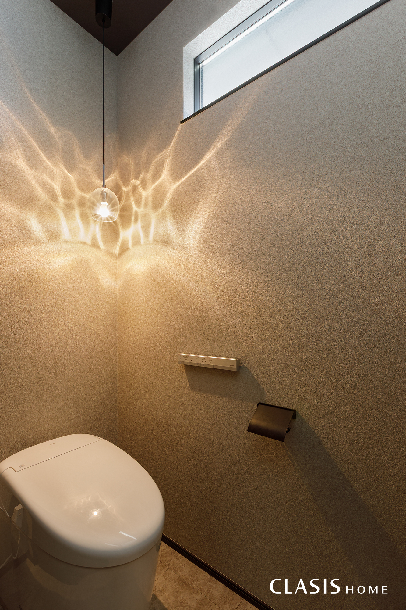 グレーの壁紙をベースにした落ち着きのあるモダンなトイレ空間。余計なものを削ぎ落としたシンプルな構成が、照明の美しさをより一層引き立てています。