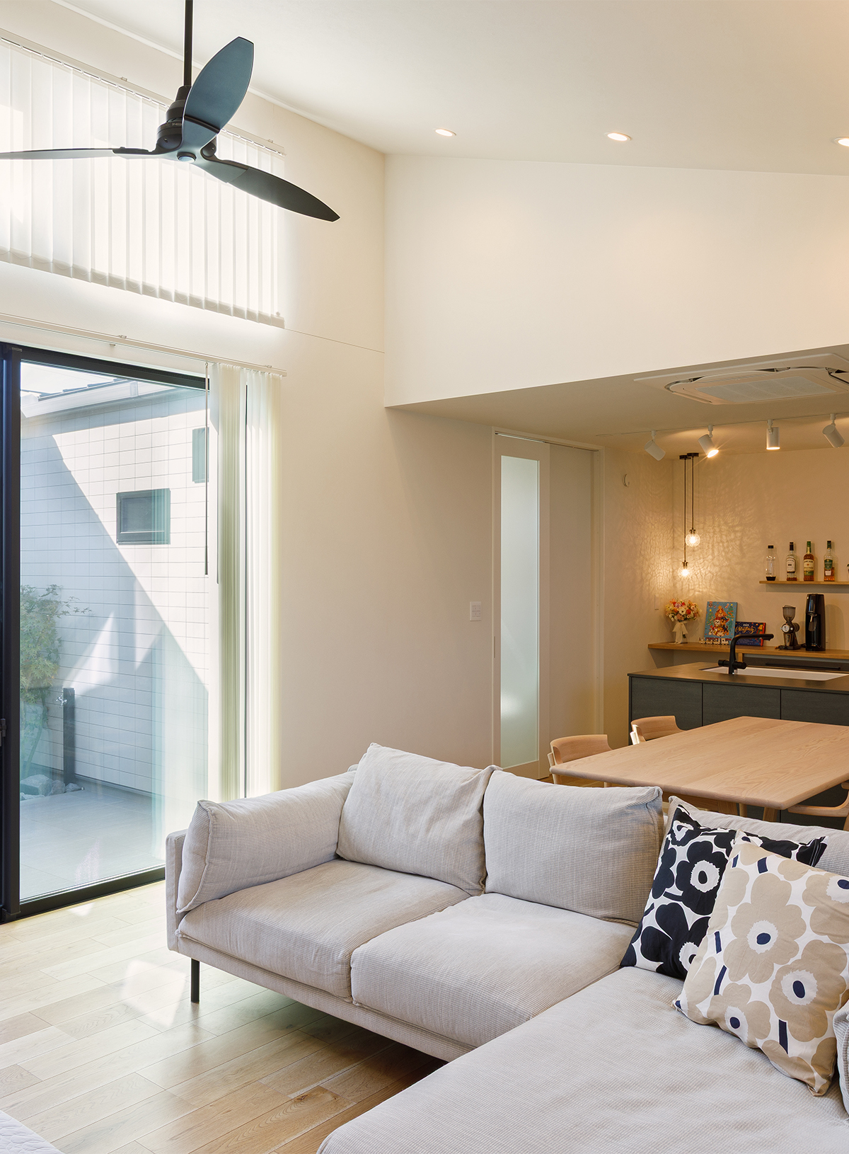 リビングには中庭が併設されており開放感のある空間に。お打ち合わせ段階から中庭との繋がりを意識し、窓の配置や素材感を吟味しました。大開口の窓越しに中庭を眺めながら、家族が自然と集まり、思い思いの時間を過ごせる心地よい空間です。