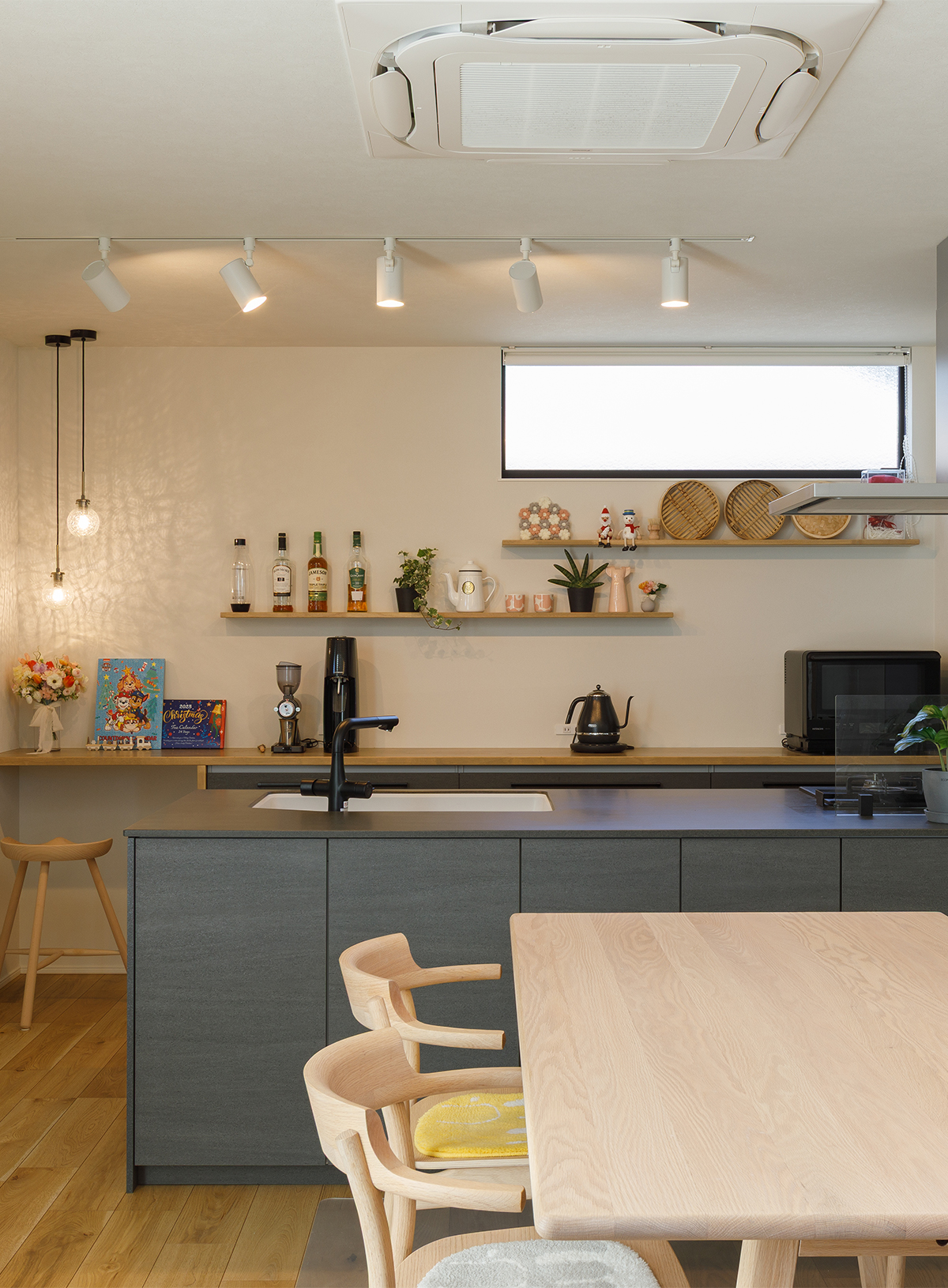 キッチン背面には、お施主様こだわりの小物をディスプレイできる飾り棚を設け、毎日の家事が楽しくなるような空間に。カップボードの横にはお子様用のスタディスペースを併設しました。お料理中も目が届く距離で、お子様が絵本を読んだりお絵描きをしたりと、自然と親子の関係が深まるような設計です。