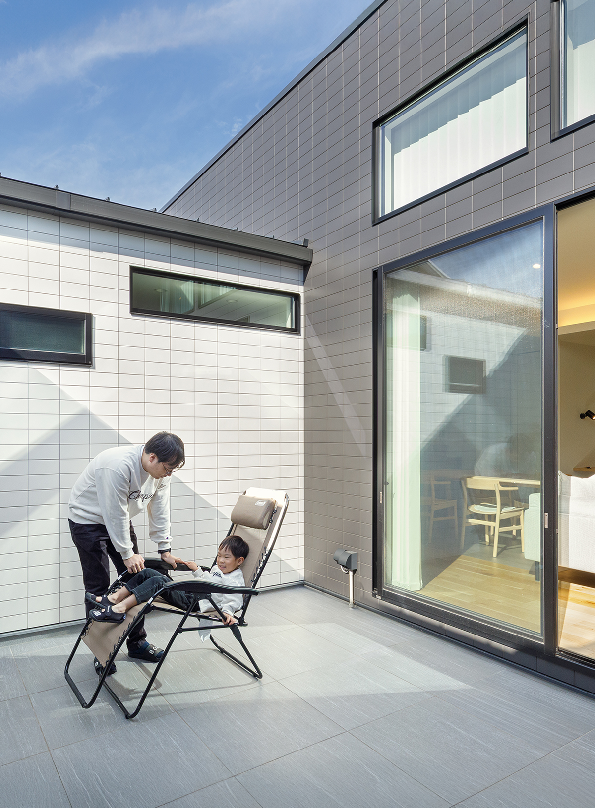 ロの字型に囲うような配置で、外からの視線を完全にシャットアウトしたプライベートな中庭。カーテンを開け放したまま、太陽の光と風を感じてリラックスできる、暮らしにゆとりをもたらす空間です。