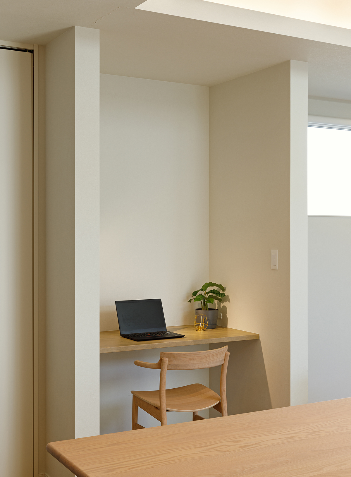LDKの一角には、壁でほどよく囲われたご主人様のワークスペースを配置。家族の存在を感じつつも、集中して作業できるようなバランスです。