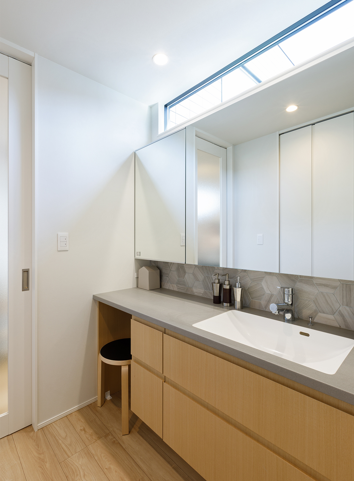 造作洗面台には、ゆったりと身支度の時間を過ごせるように椅子を収納できるスぺ―スを設けました。大きな一面鏡と機能的な収納付きミラーを組み合わせ、デザイン性と利便性を両立させています。上部の高窓から自然光が降り注ぐ、明るく清潔感あふれる空間です。
