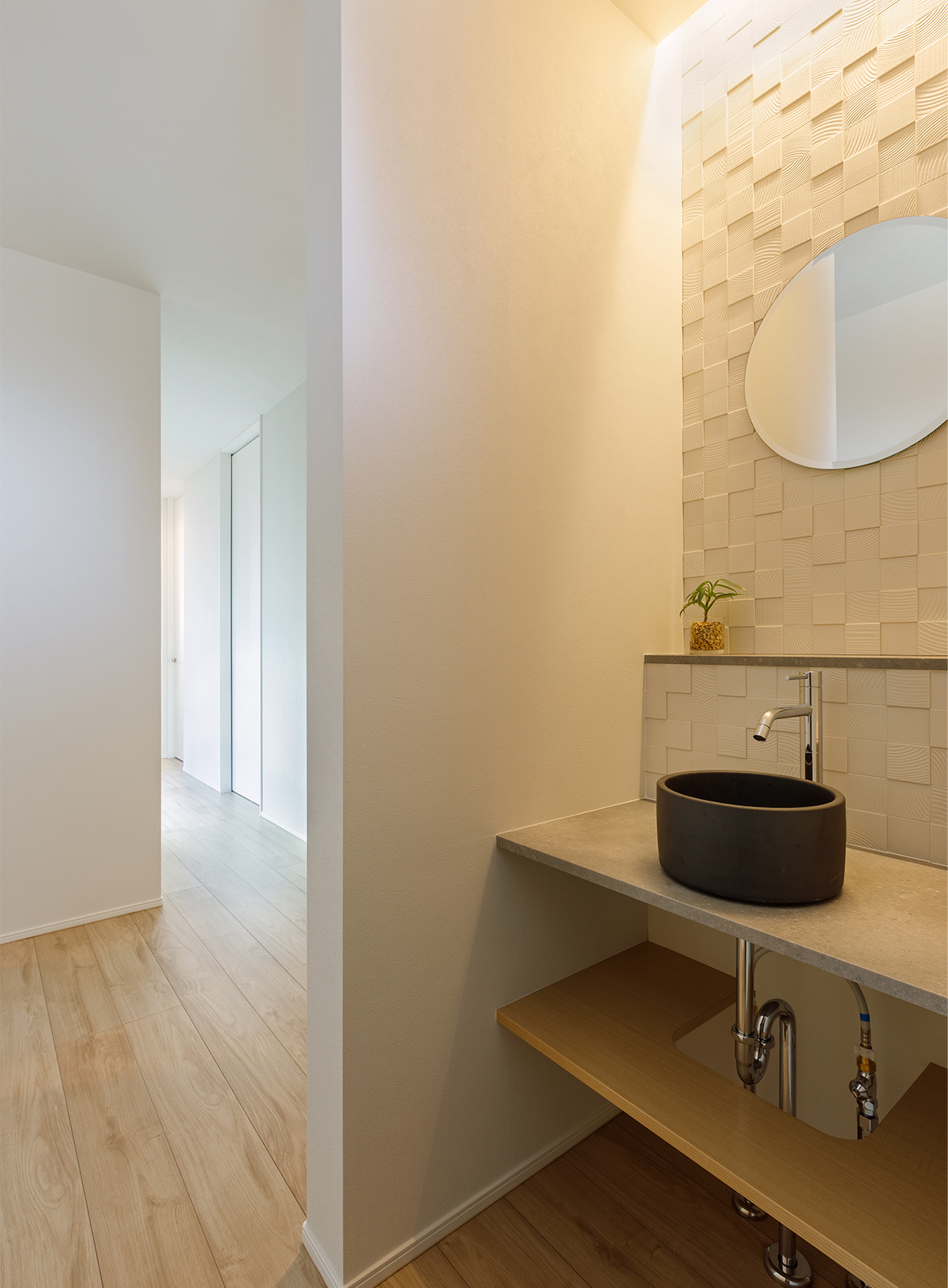 丸いミラーやマットな質感のボウルを組み合わせ、ギャラリーの一角のような雰囲気の造作手洗い。壁をふかしてカウンターを設けることで小物を置けるように設計しました。天井からの間接照明がタイルの凹凸を美しく照らし、より雰囲気を高めています。
