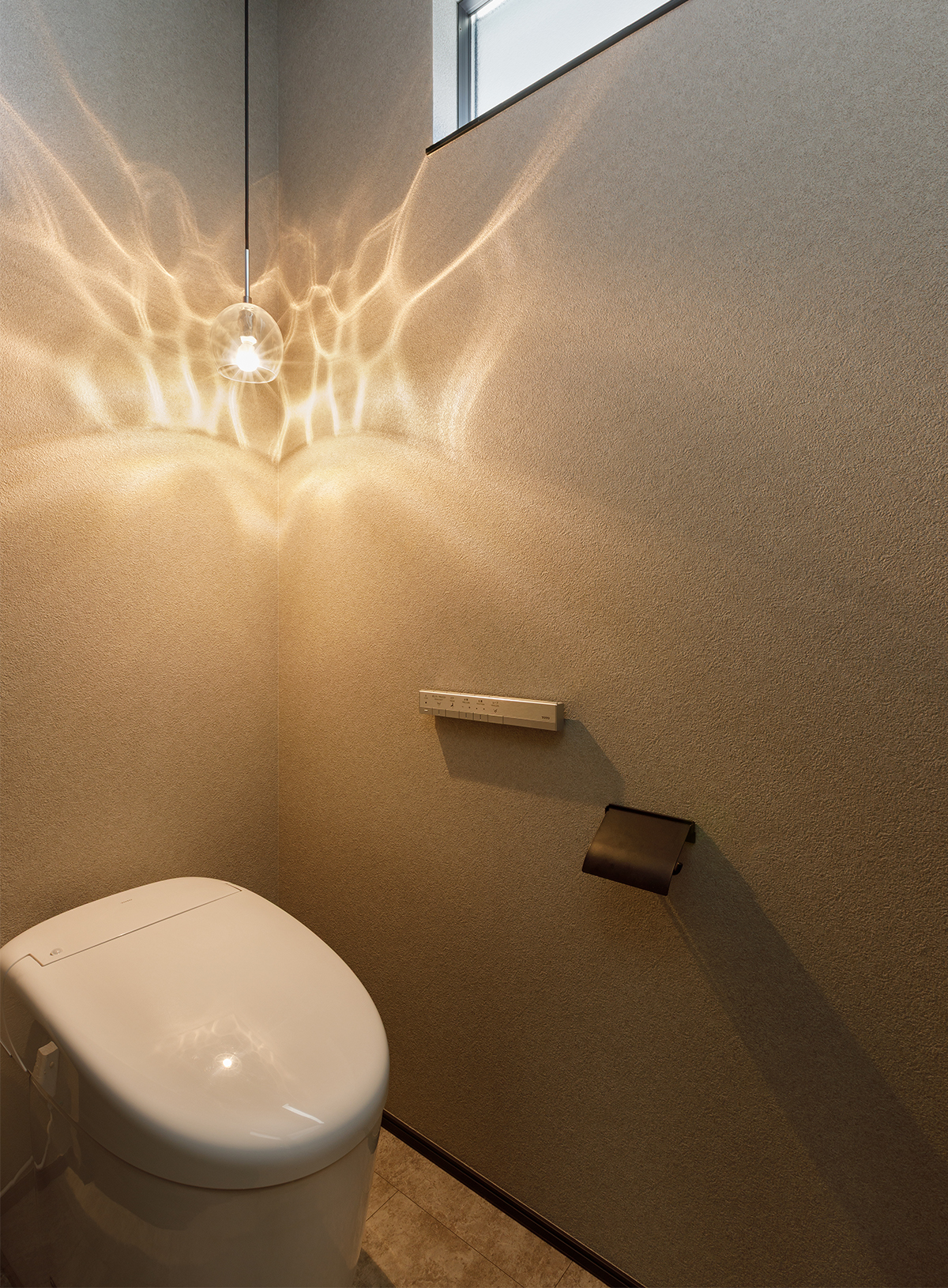グレーの壁紙をベースにした落ち着きのあるモダンなトイレ空間。余計なものを削ぎ落としたシンプルな構成が、照明の美しさをより一層引き立てています。