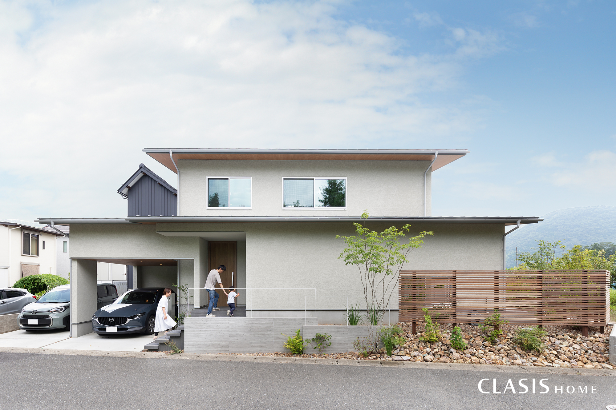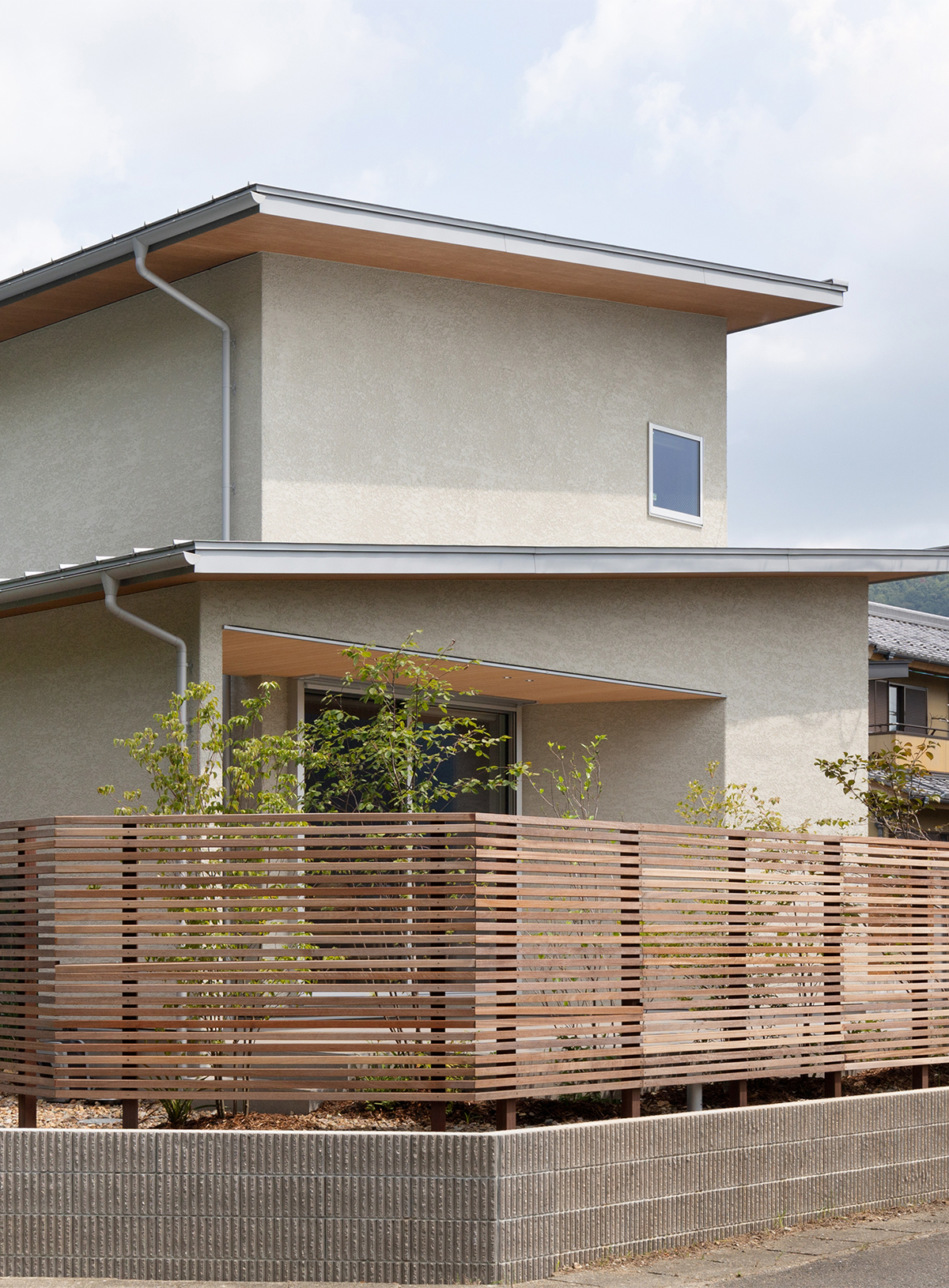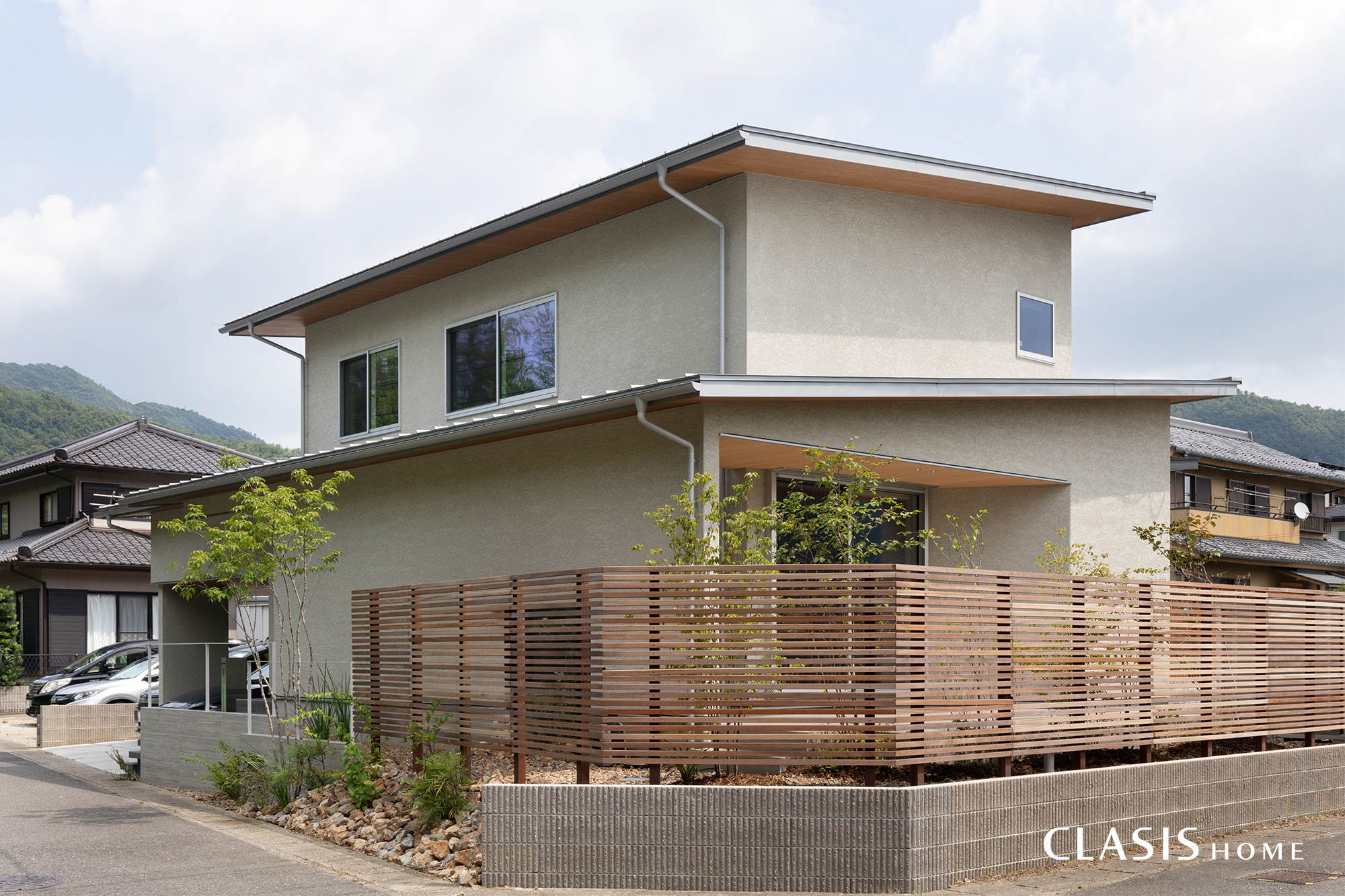 周囲の景観に溶け込むように色味を抑えて、塗り壁や木目調の軒天でシンプルにまとめた外観。3方向から見える立地のため、各方向から見たときの意匠も考えて設計しています。