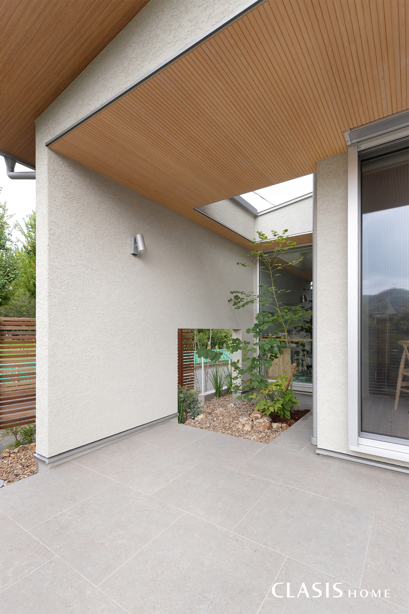 目前に公園が面しているため、ウッドフェンスや植栽の配置でプライバシー性を確保。適度に視線が抜けるような囲いにすることで、閉塞感を無くし、室内からは程よく外の景色を楽しめるようなバランスに仕上がりました。
