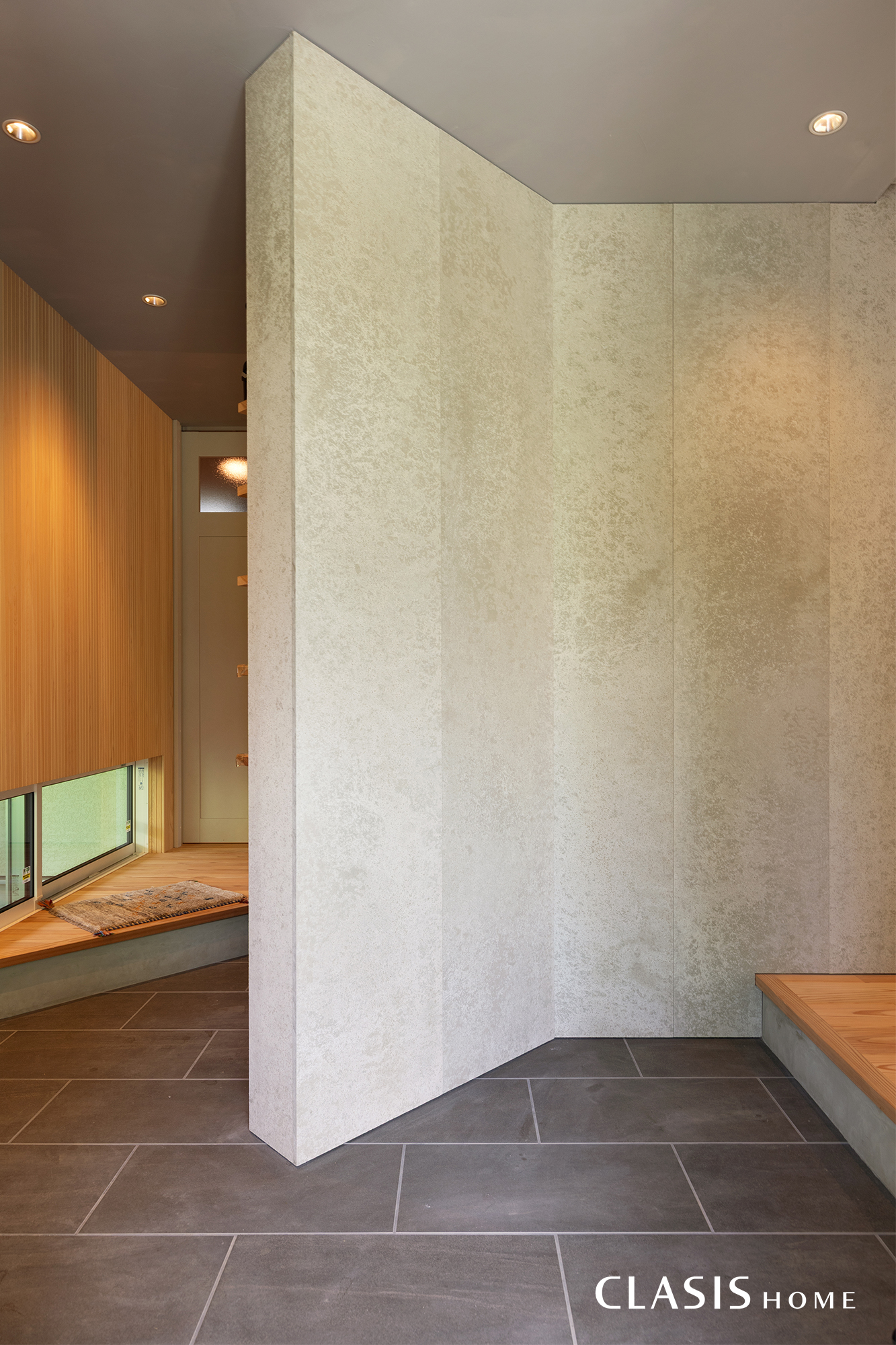 「SOLIDO」のアクセント壁が印象的な玄関ホール。玄関からすぐにリビングへと繋がる間取り計画のため、自然とリビングへと人の流れや視線が向かうように斜めに壁を設けました。奥は玄関収納などがある帰宅動線になっています。