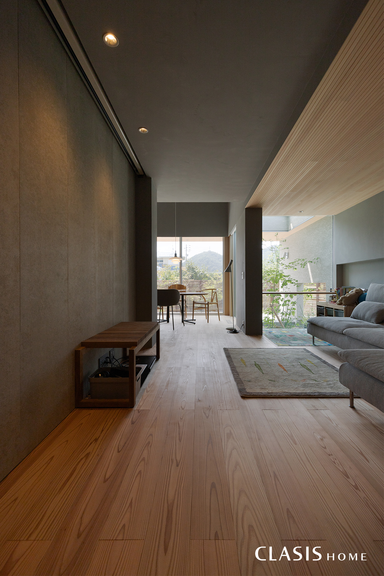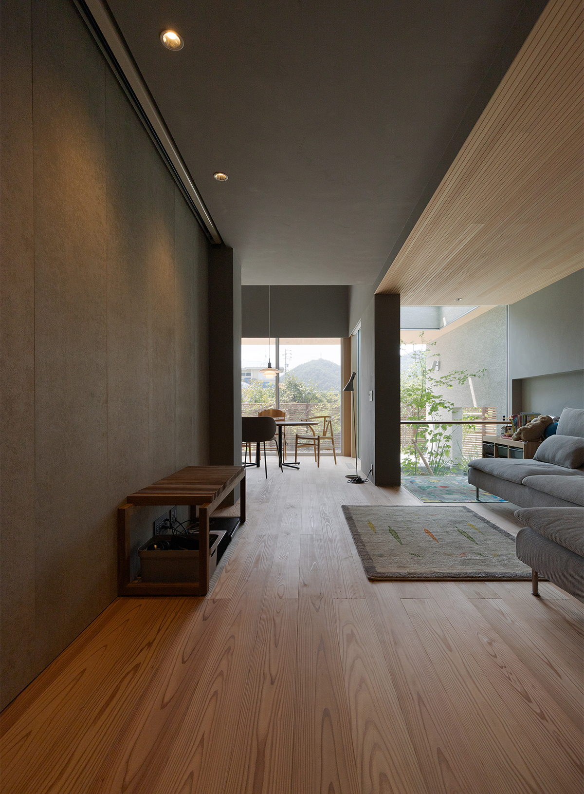 玄関を上がると、リビングを通してそのまま外の風景へと視線が抜け、LDK全体に奥行きが感じられます。一方で天井を少し低く設計しているため、ほどよいこもり感が生まれ、包み込まれるような落ち着いた雰囲気になりました。