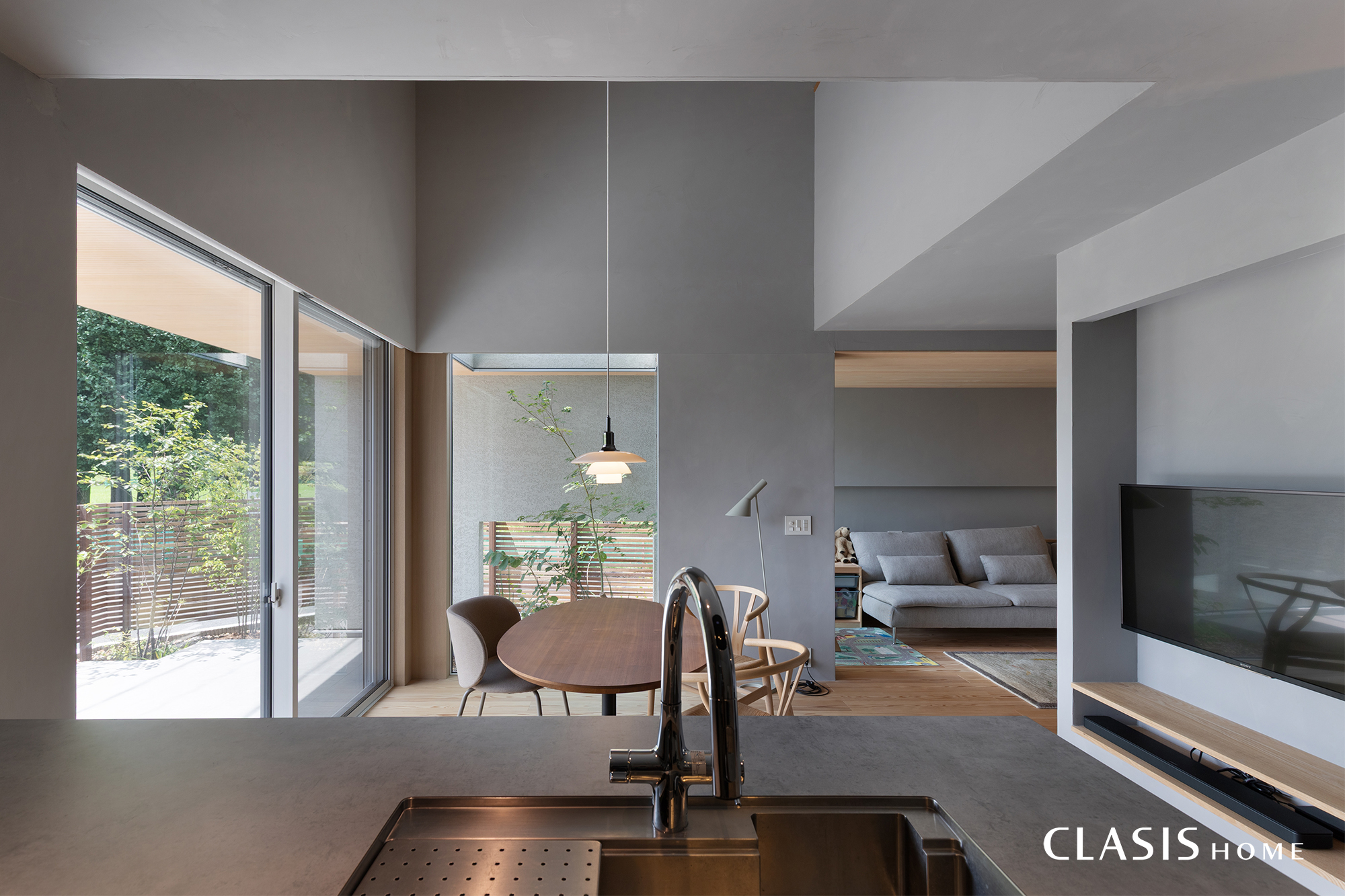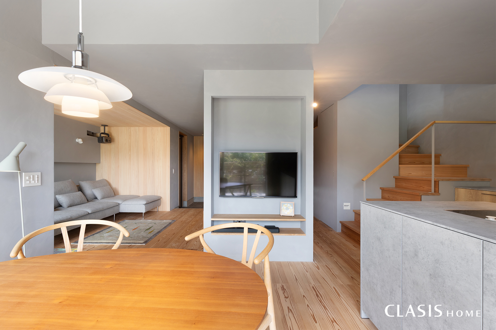 近年はLDKを大きく一体化する間取りが主流ですが、リビングをあえて半分独立させて家族がそれぞれ心地よい場所で過ごせるよう想定した間取りを計画。ダイニングキッチン側のテレビは存在が目立たないようニッチを作り、壁の中に収めました。