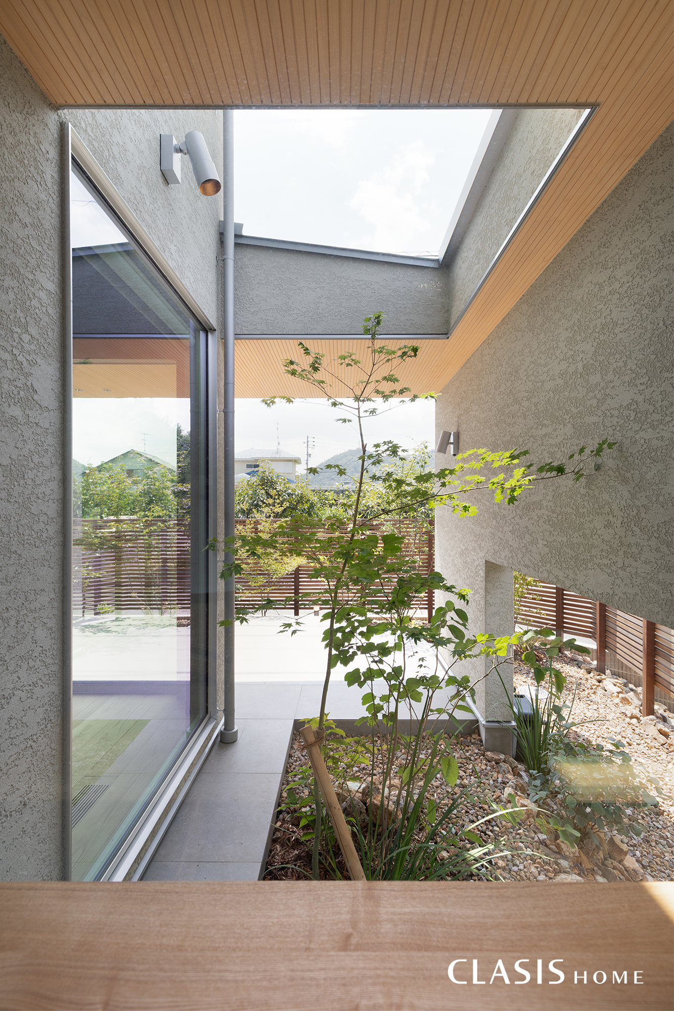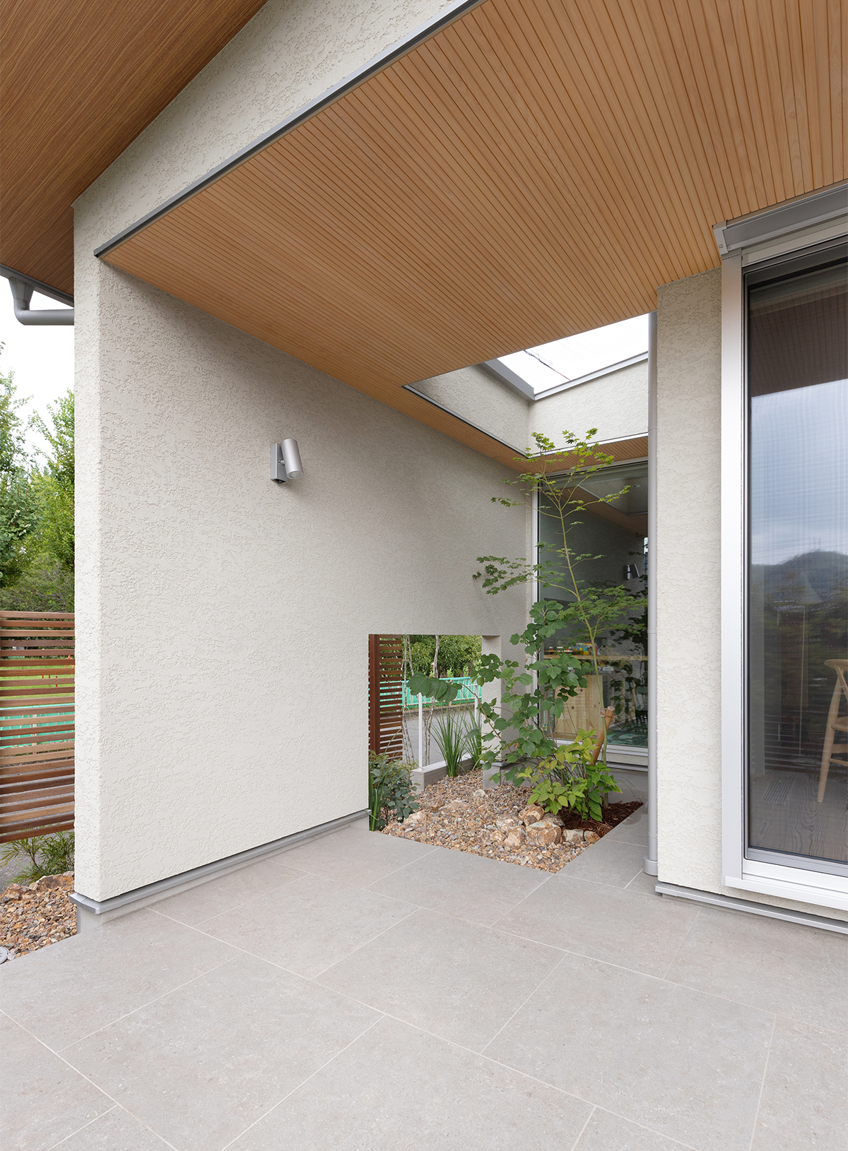 ダイニングやキッチン、リビング横のフリースペースからは坪庭やタイルテラスが眺められます。壁の下半分や屋根を一部くり抜いたことで、西日を遮りつつも、近所の公園の景色や日の光を室内に取り込めるようにしています。