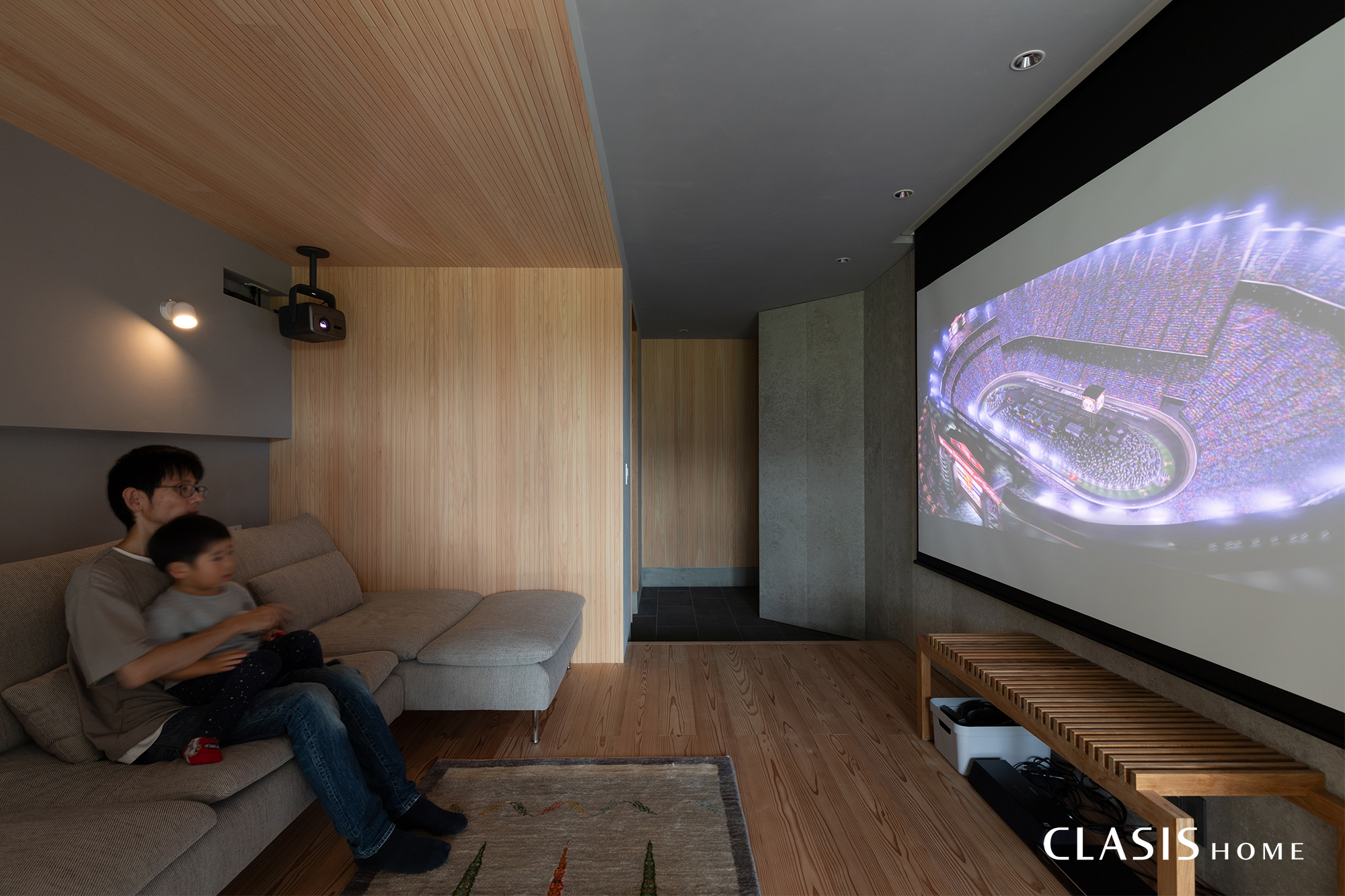 リビングにはプロジェクターとスクリーンを設け、照度を落とした落ち着いた空間になるようコーディネートしました。スイッチやコンセントを目立ちにくい位置や高さに配置したり、ソファ背面に小物を置けるニッチを用意したりするなどして、素材感豊かな空間にノイズが入らないようにしています。