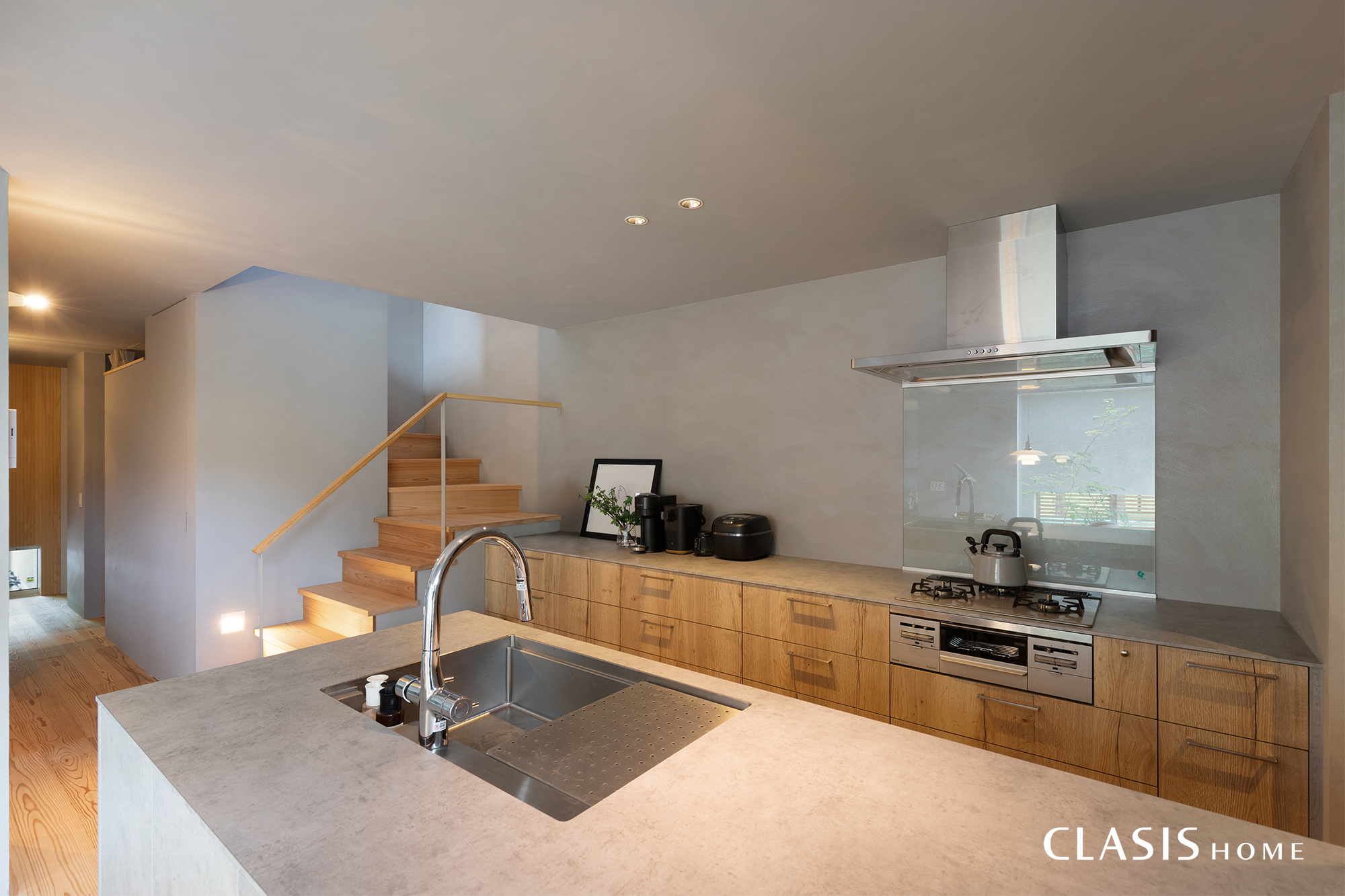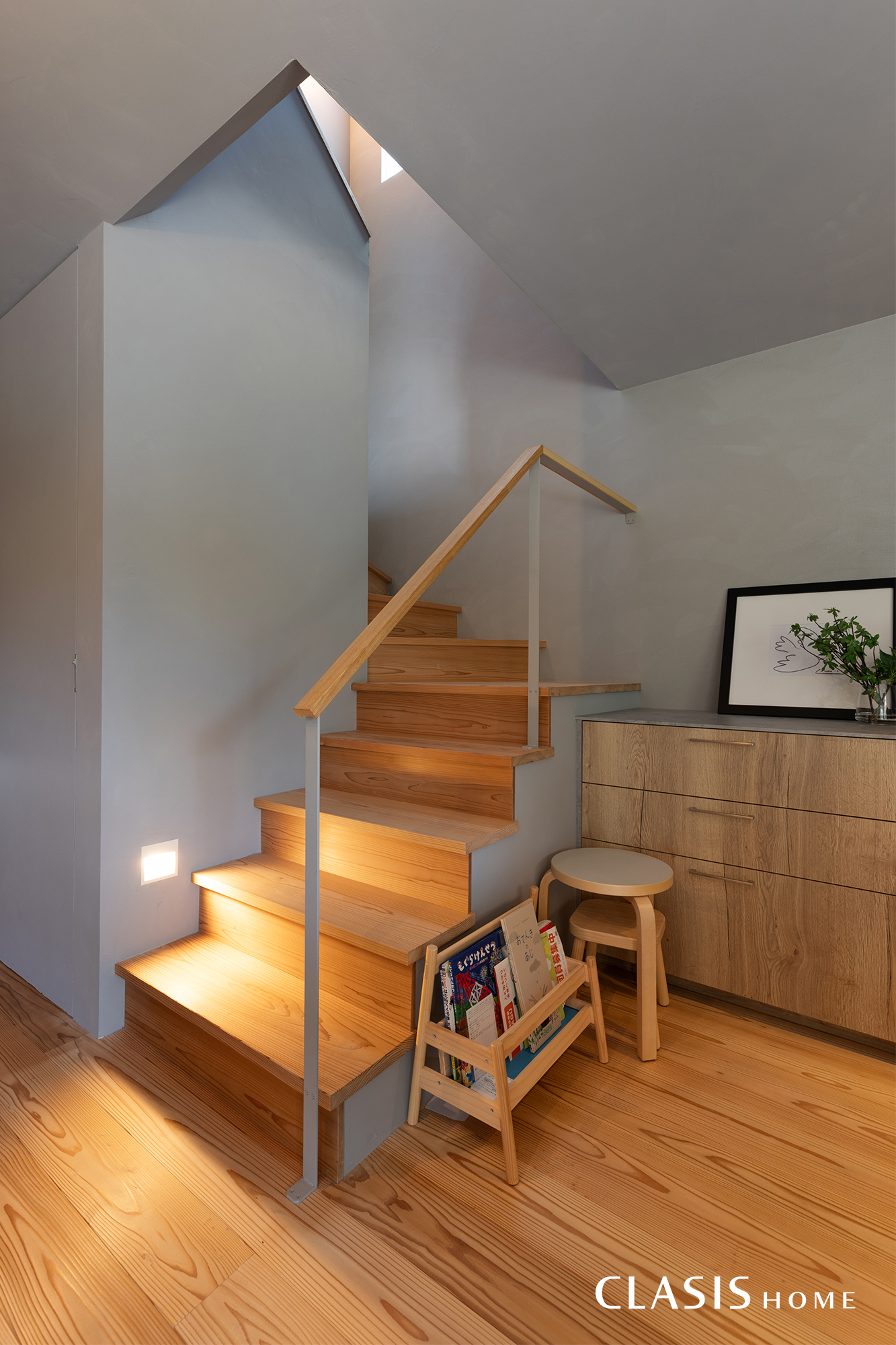 階段にも床材と同じスギ材を使用し、手すりや照明なども極力周りの雰囲気に馴染むものを選んでいます。階段下収納の扉は造作で仕上げ、壁面と同じ塗り壁材を用いることで統一感を持たせました。