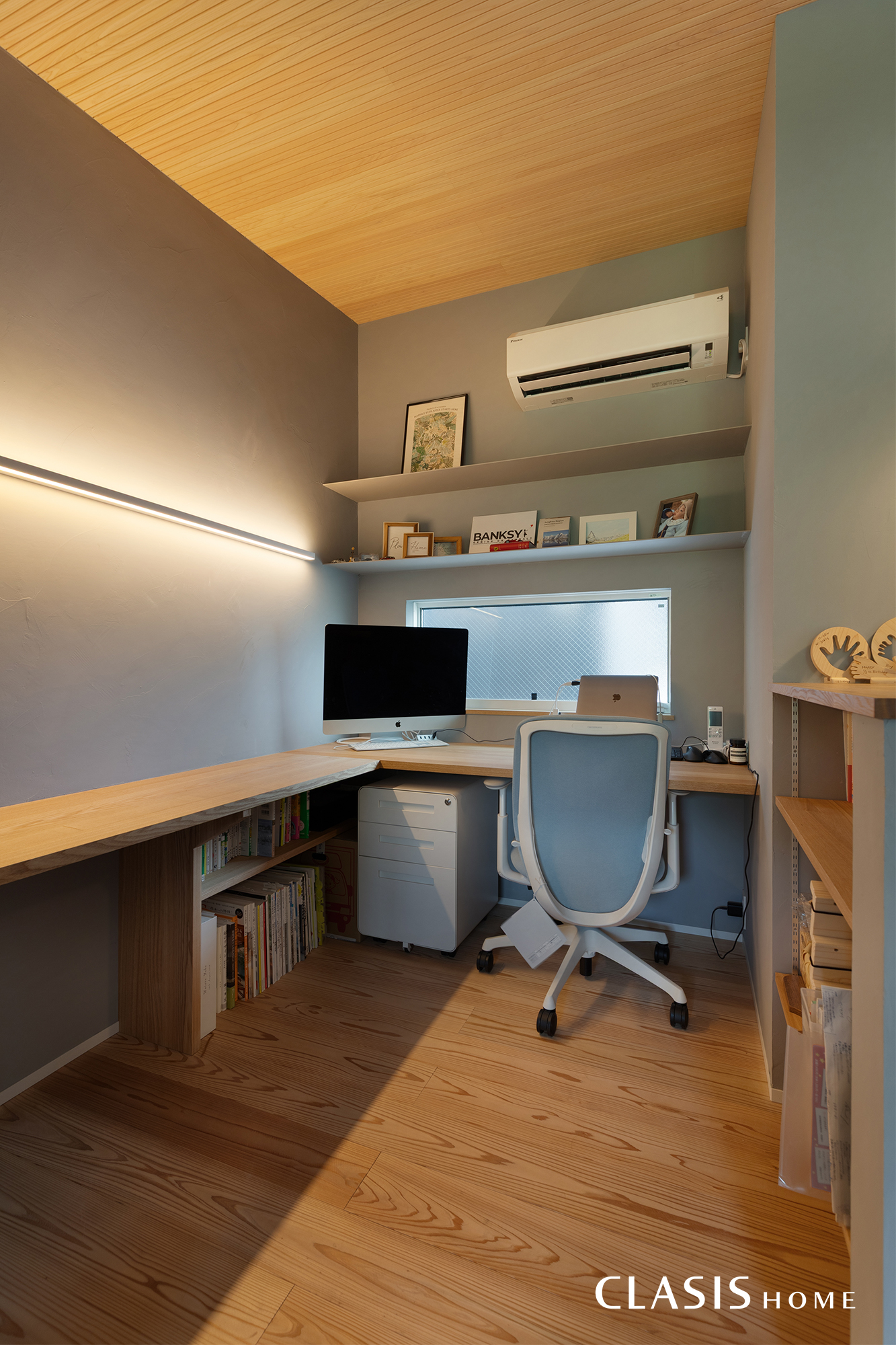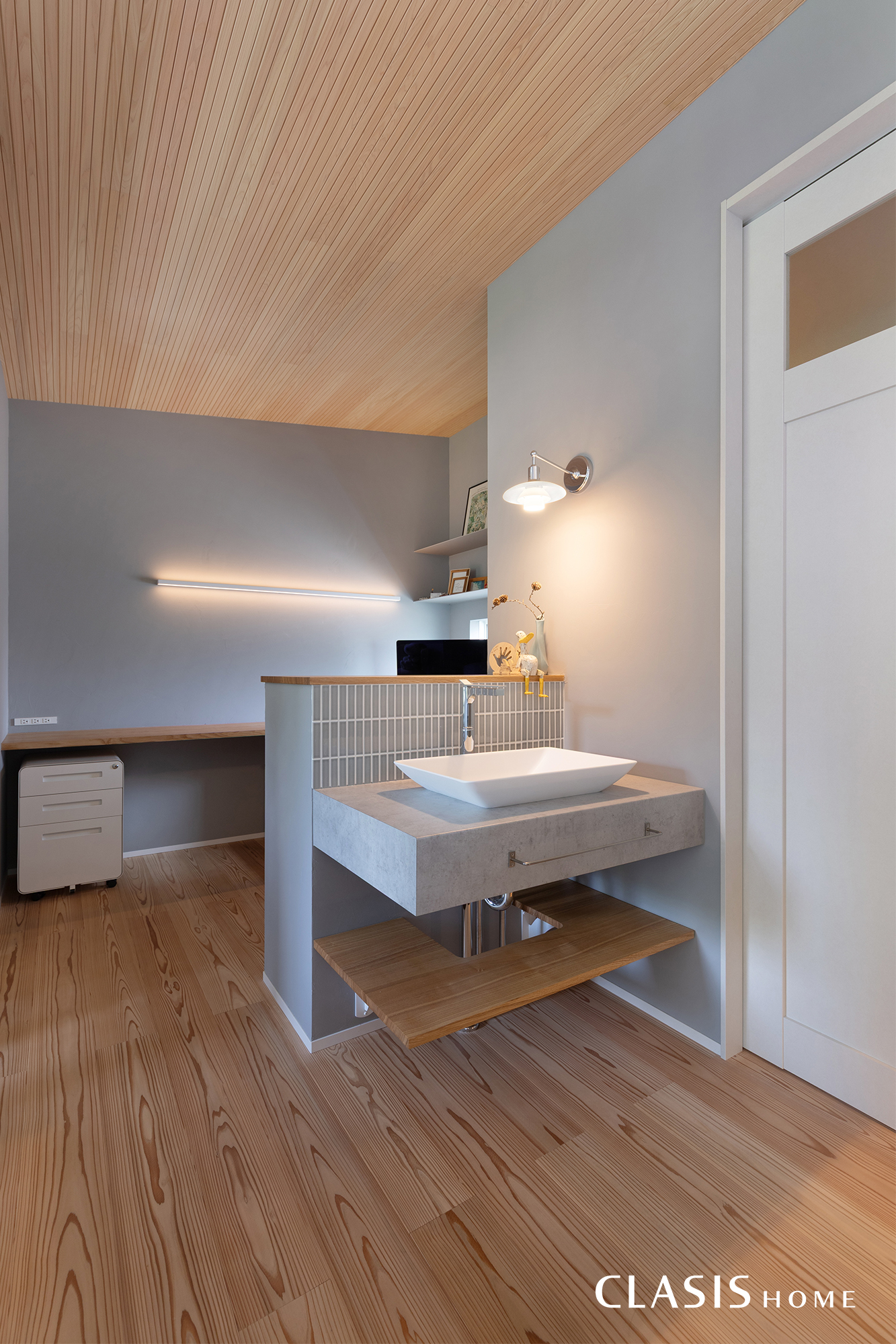 2階のホールには手洗いスペースとワークスペースも。天井のヒノキ材が美しく映えるように、ダウンライトは使用せず、壁付けのPHランプで明るさを確保しました。ワークスペースはカウンターを広めに作ることで、将来的にお子様も一緒に勉強や作業ができるように設計しています。