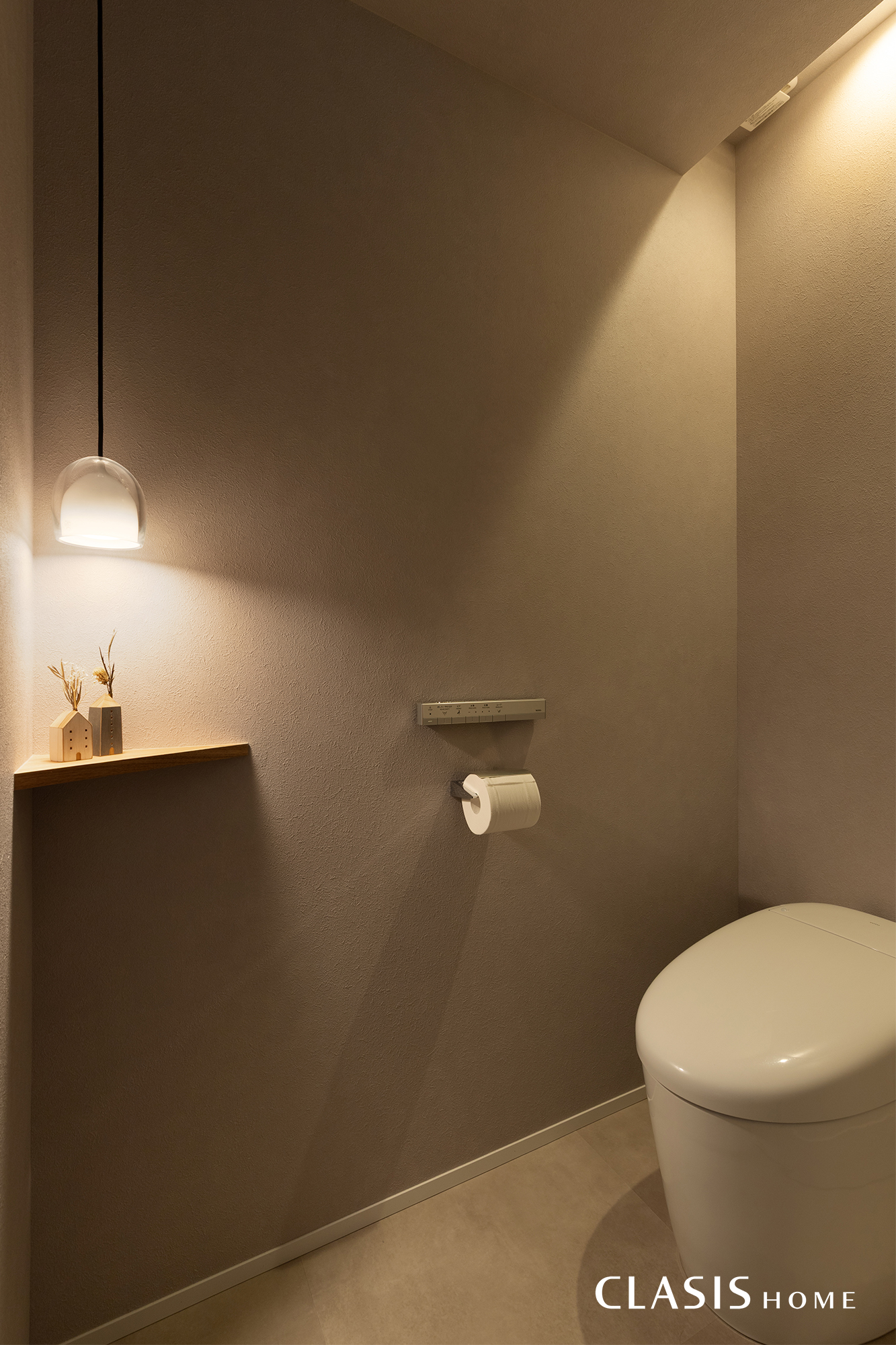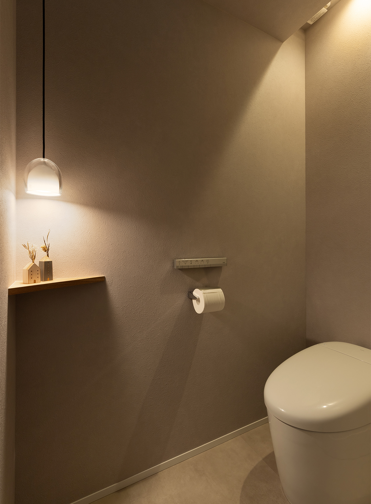 落ち着いた雰囲気と余計なものを見せない方針はトイレ空間にも徹底されています。天井を折り上げている部分には換気扇とダウンライトが隠してあり、一見すると間接照明のように見える仕上がりです。