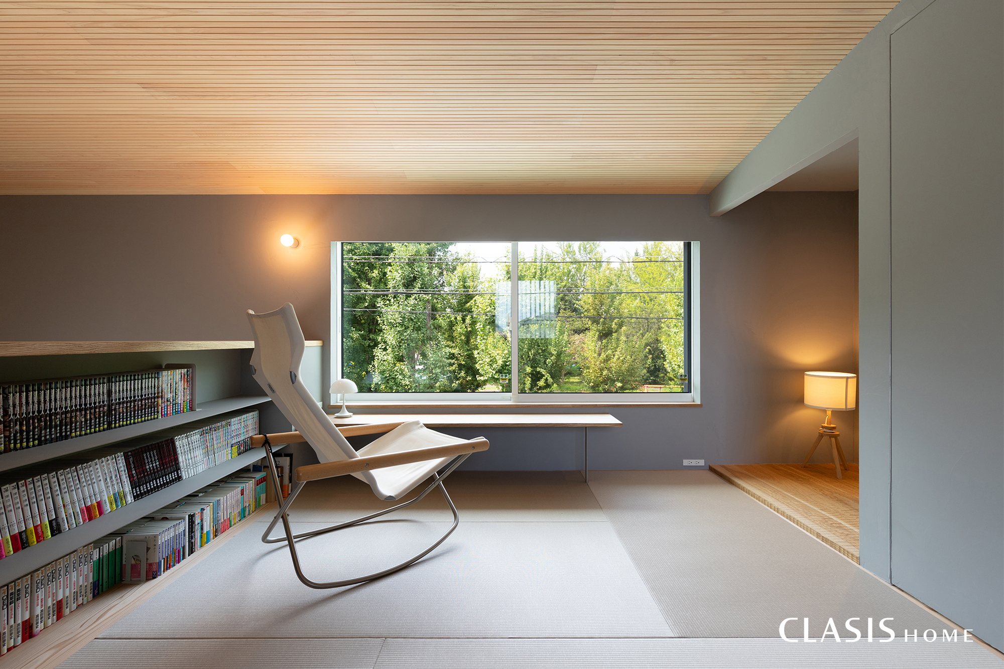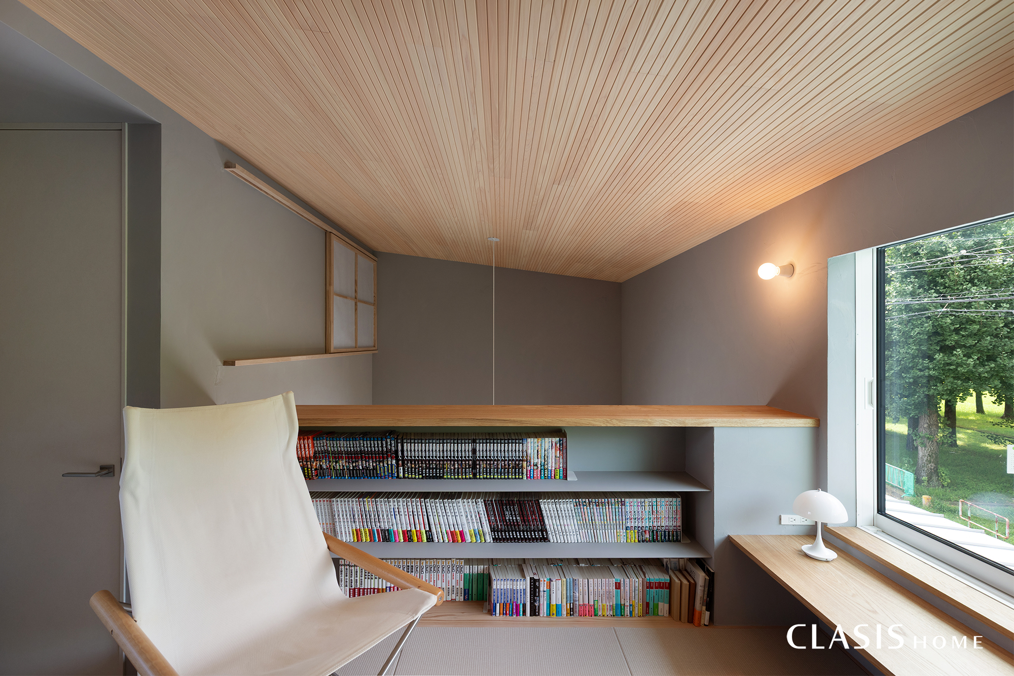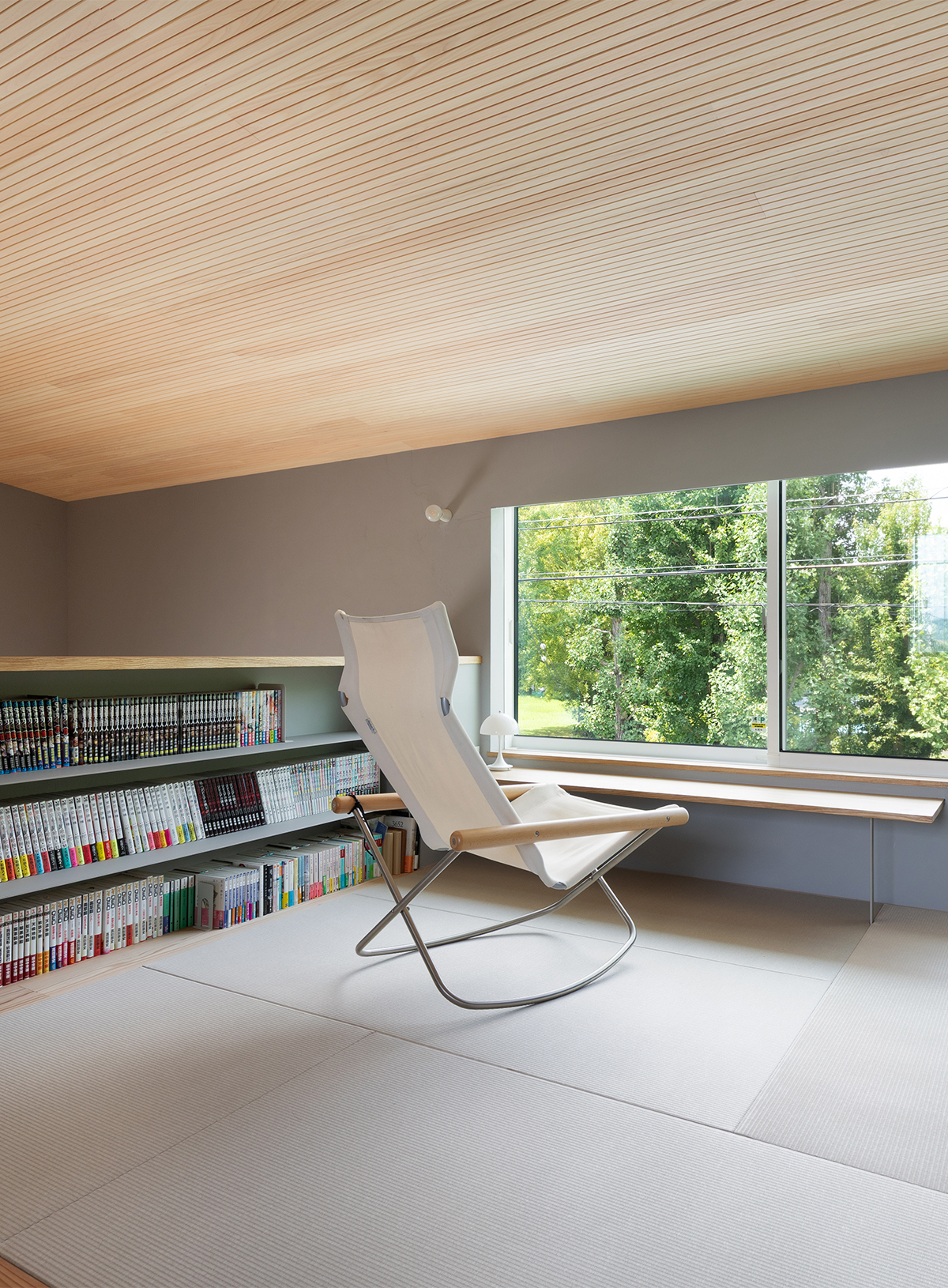 秋には公園のイチョウ並木が綺麗に見えるように、2階の畳スペースには景色を楽しむための窓を配置しました。その際、ノイズになるような窓枠やロールスクリーンは壁内に隠し、窓の高さを低めにするなど、景観を愉しむために繊細に仕上げました。