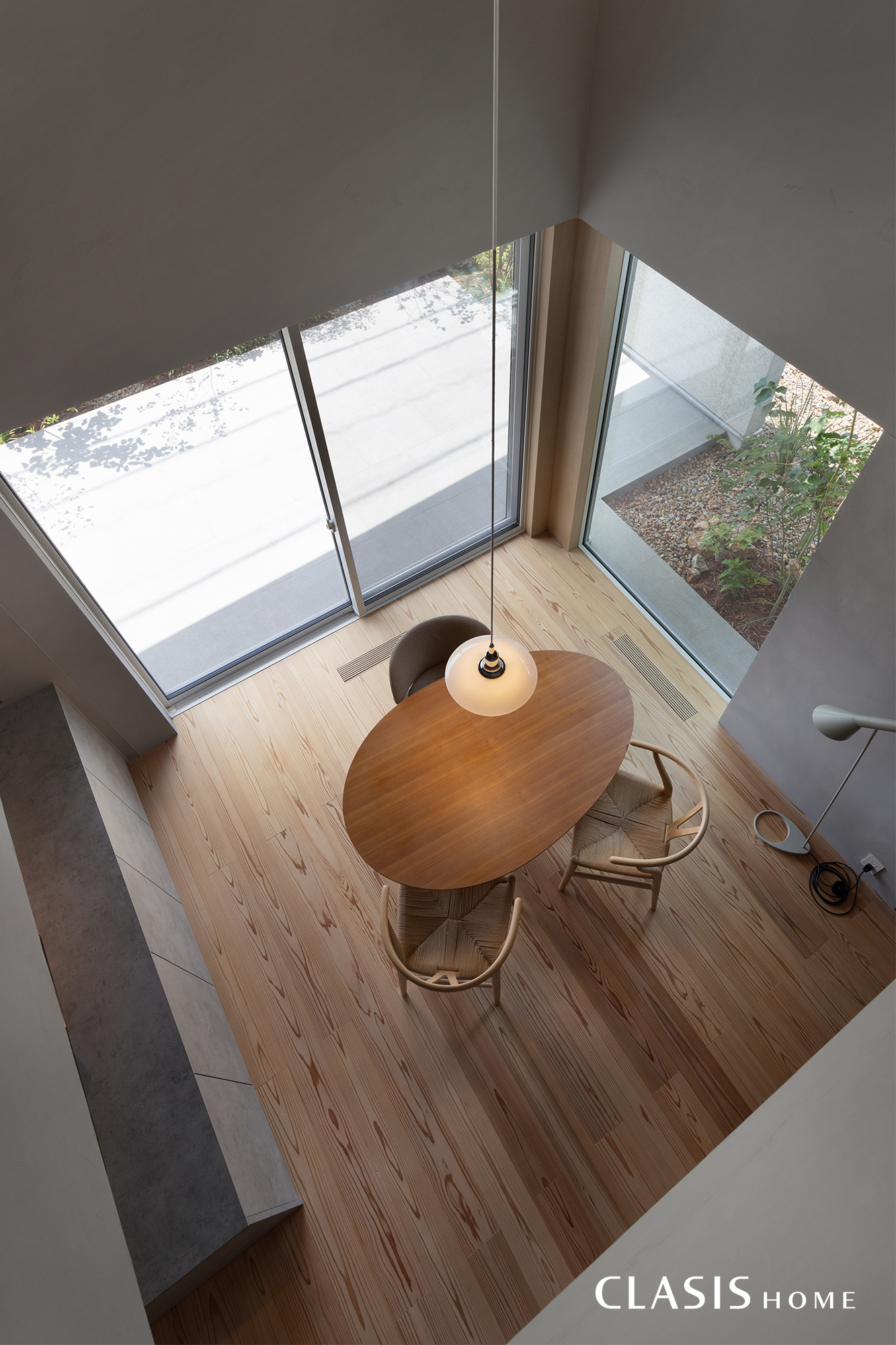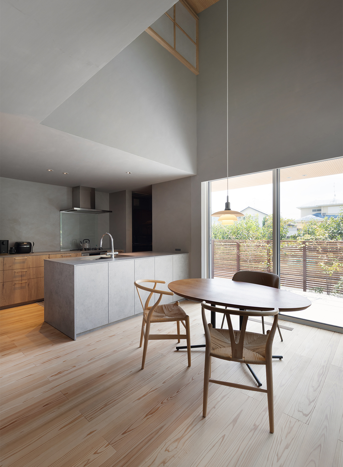 キッチンからの景色が一番よく映るように窓の配置を考慮し、LDK全体と外の景色が見渡せる配置にしています。PHランプがメイン照明のダイニングは、落ち着いた雰囲気を出すために他の照明は極力目立たなくしています。