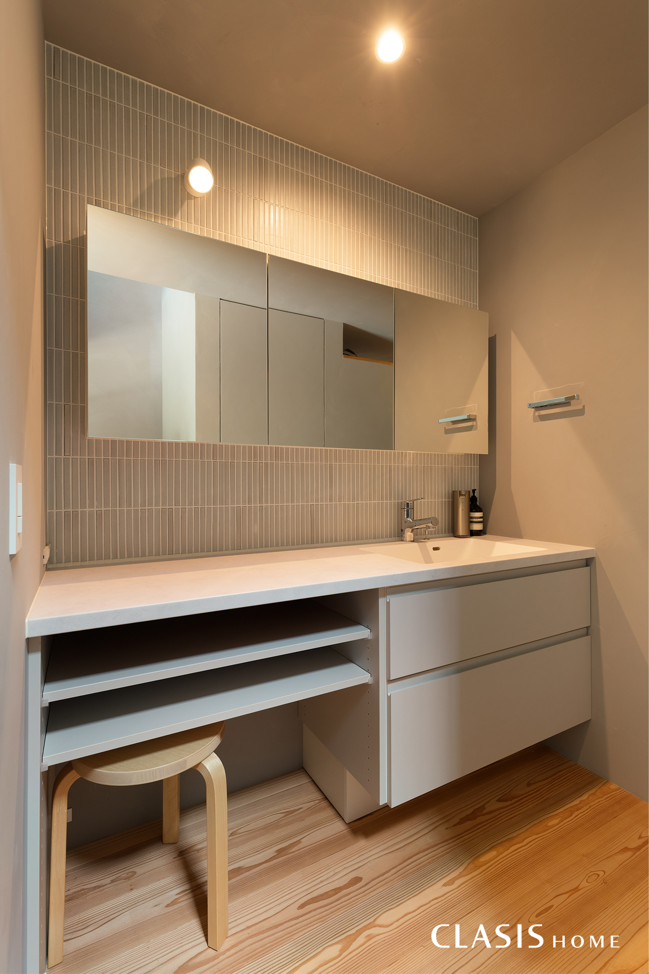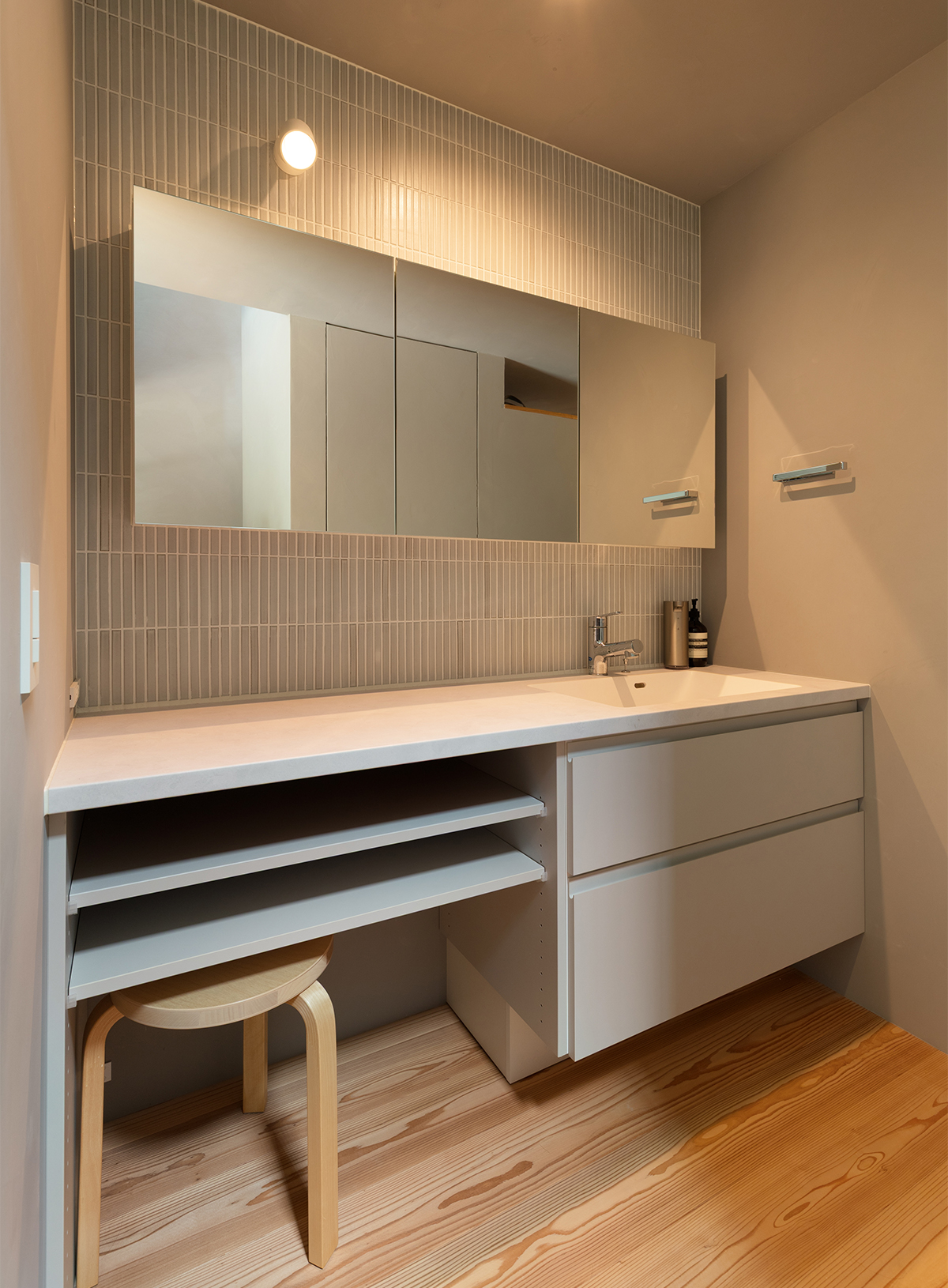 洗面台はボウル側とカウンター側で並んで身支度できるタイプのものをセレクト。アクセントタイルは色味は抑えつつも、素材感のあるタイルを全面に貼ることで落ち着いた雰囲気に仕上げています。