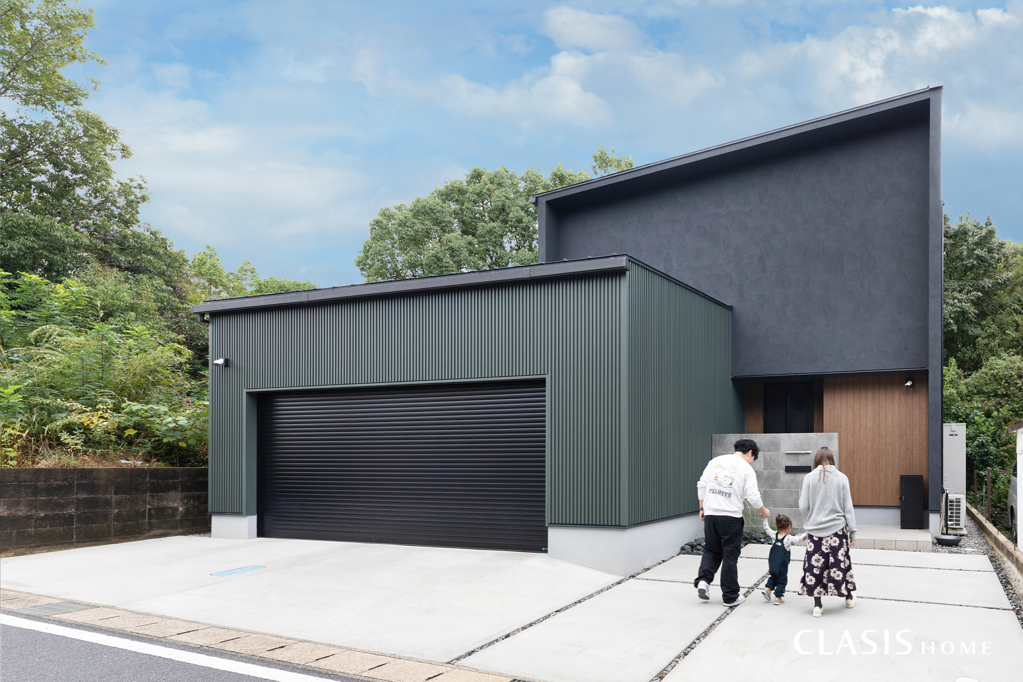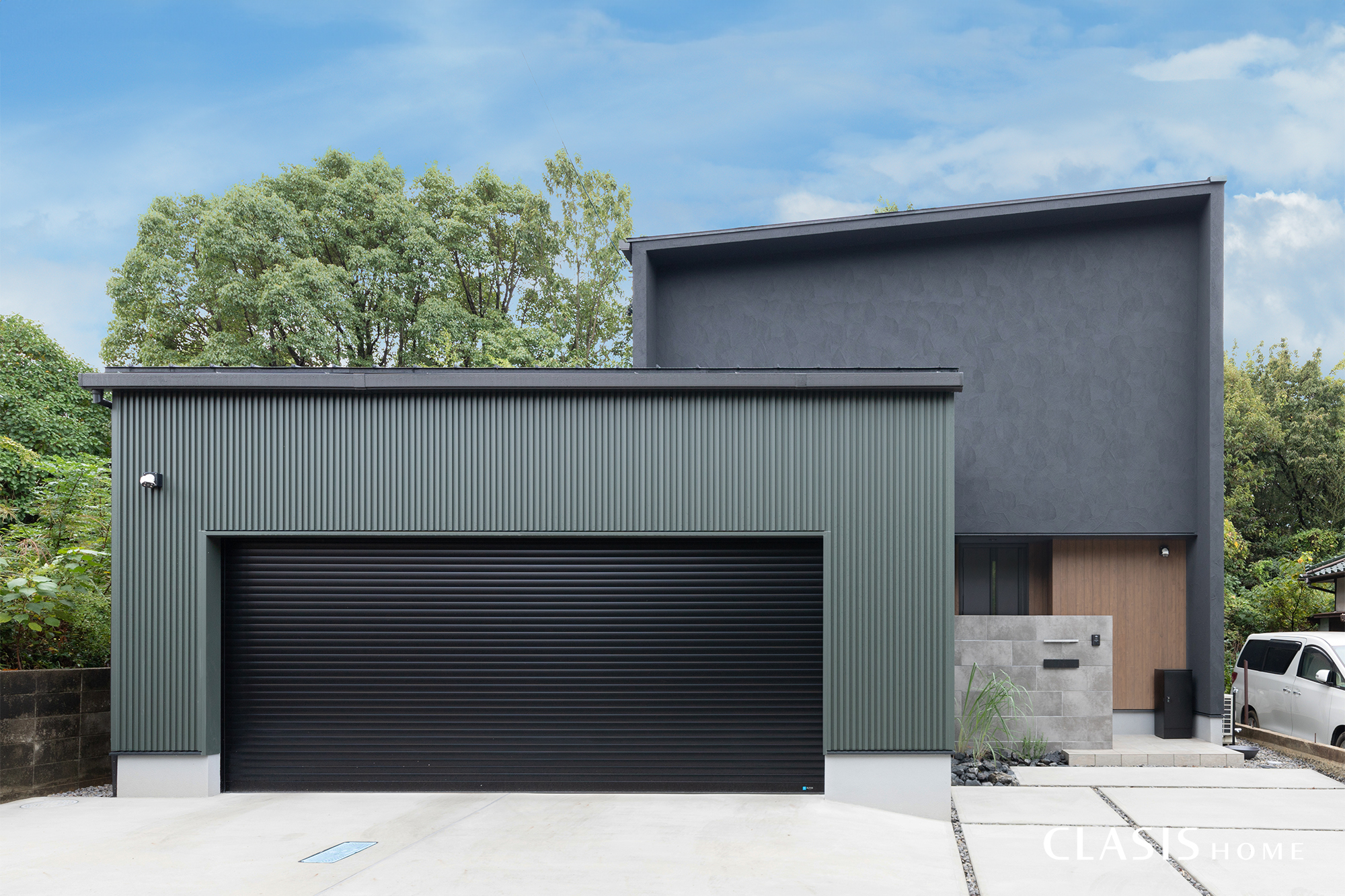 深みのあるグリーンのガルバリウム鋼板と黒の塗り壁を組み合わせた、圧倒的な存在感を放つ外観。道路側からの視線を遮るため開口部を最小限に抑え、プライバシーを守りながらもデザインとしての塊感を強調しました。2台分のビルトインガレージは、建物の一部というよりは外観の主役の一部として扱って設計を行いました。