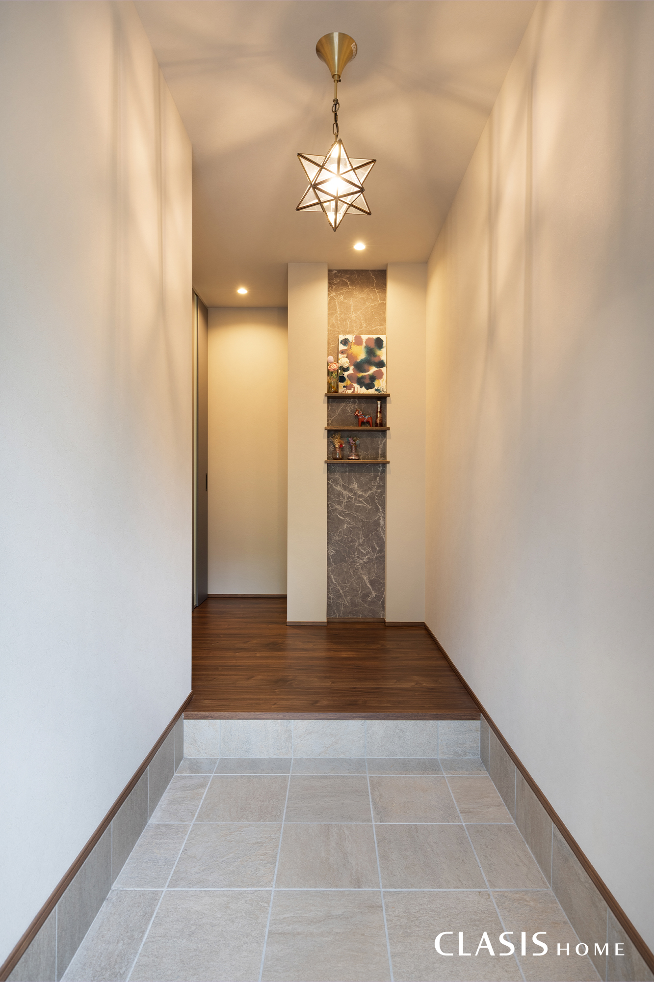 扉を開けた正面に設けたのは、石目調のアクセントクロスが映えるニッチスペース。思い出の品が並び、ご家族の温かさを感じられるスペースです。写真の画角よりも手前側ではシューズクロークを介してガレージとも土間続きで繋がっており、雨の日でも濡れることなく室内へ入れるような動線も確保しました。毎日の利便性と、暮らしを彩る意匠性を両立させた玄関周りです。