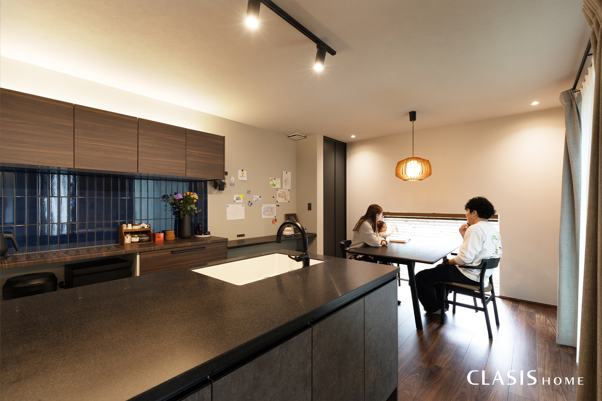 大人っぽいシックな色合いに、奥様お気に入りの濃紺タイルが艶やかな彩りを添えるキッチン。マグネット対応の壁面にはお子様の作品を飾ることができ、洗練された大人の空間の中に家族の日常が溶け込む、温かなコーナーとなりました。