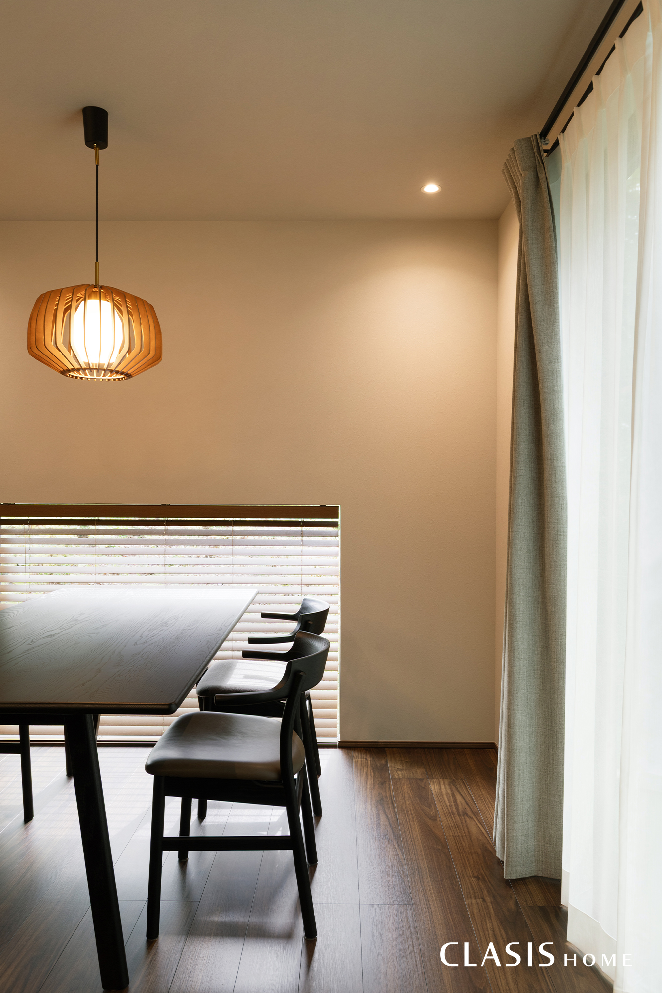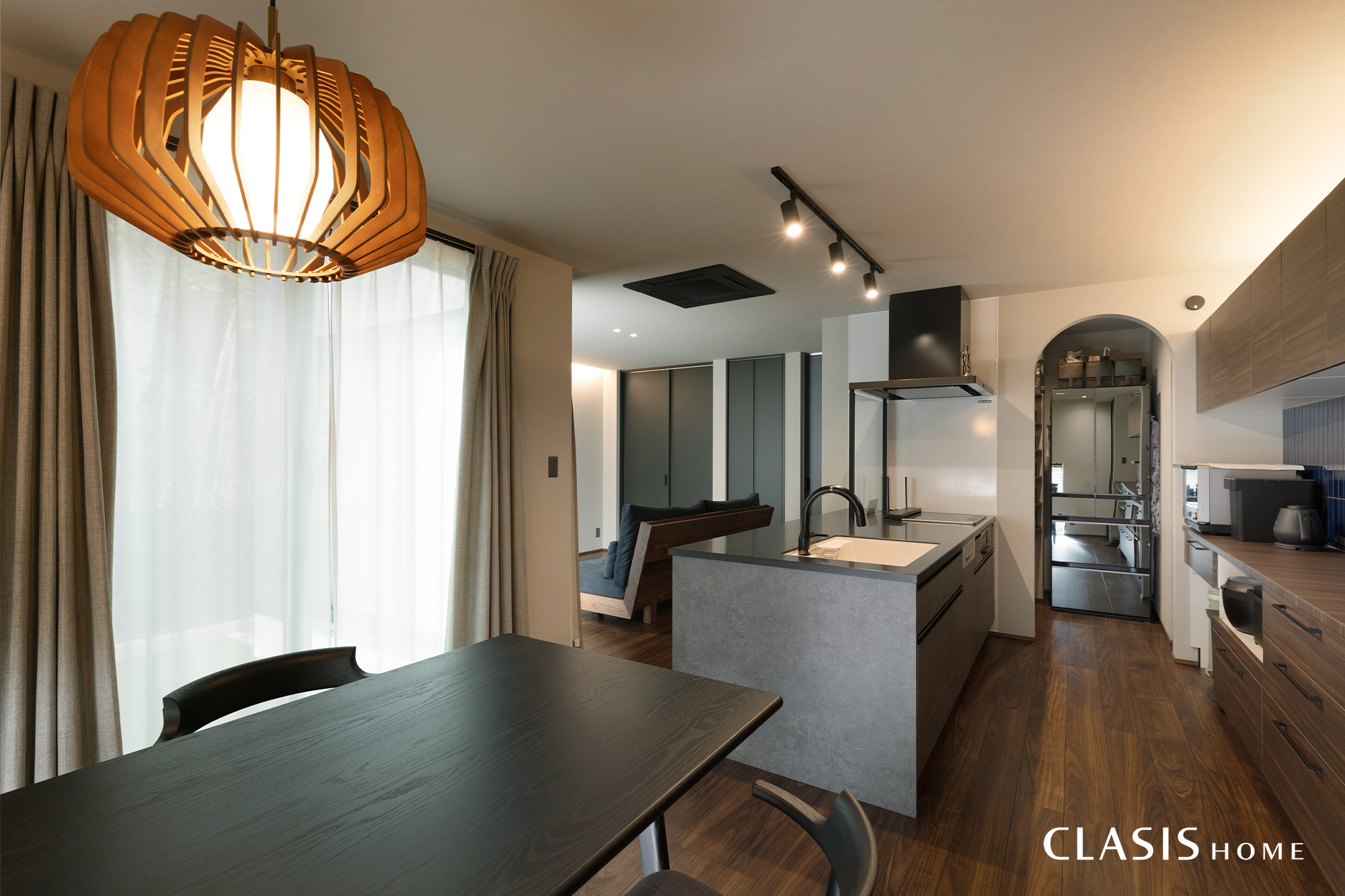 お施主様お気に入りのペンダントライトが優しく灯るダイニング。意匠性を損なわないよう、明るさを補うダウンライトは壁際に配置し、光の広がりにより効果的に明るさが保てるような工夫を凝らしました。