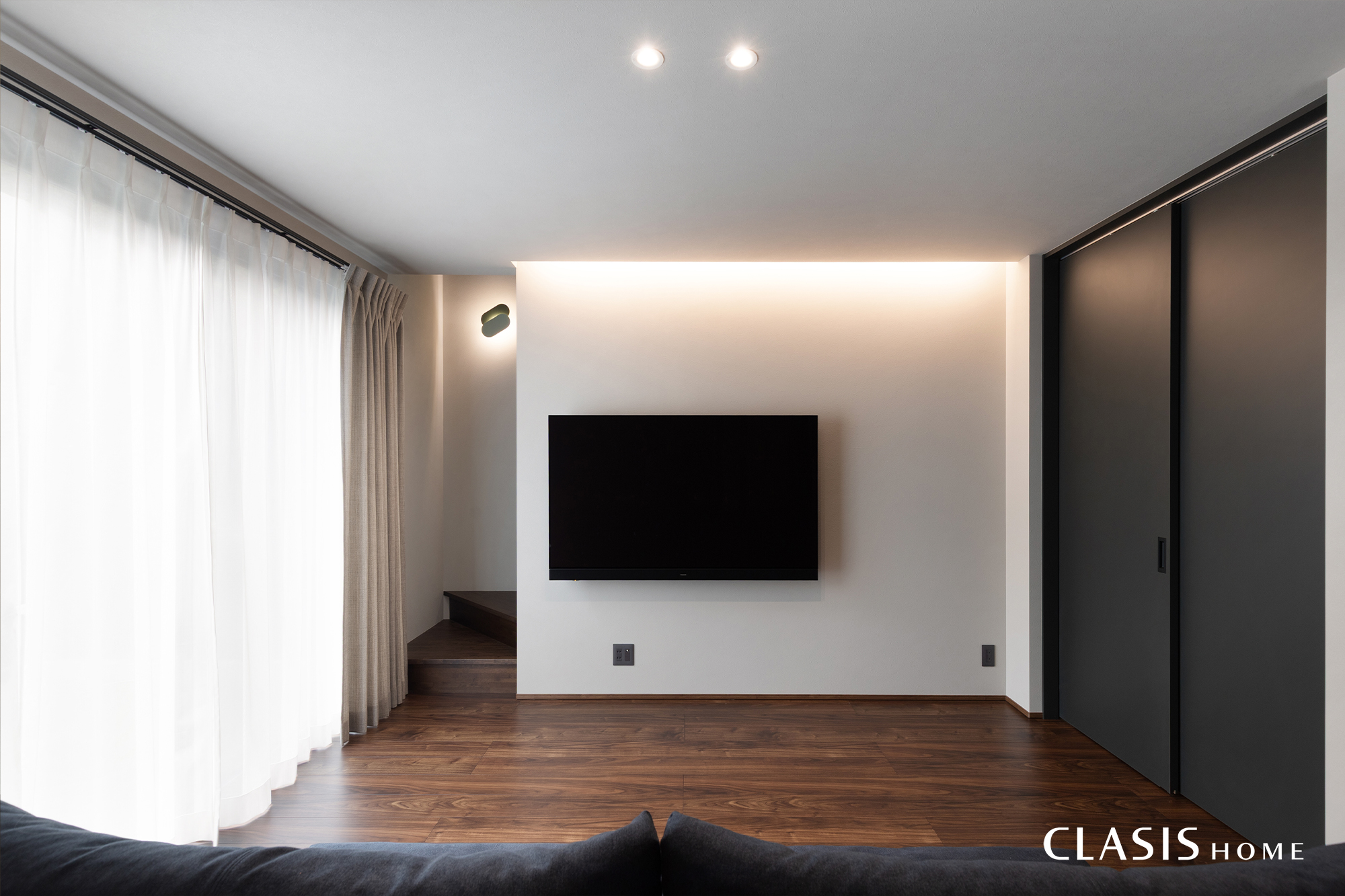リビング側テレビ面はシンプルなコーディネートに。隣接する和室は引き戸をフルオープンにしておけるため、開ければリビングの一部として、閉じれば独立した静かな空間として、シーンに合わせた使い分けが可能です。