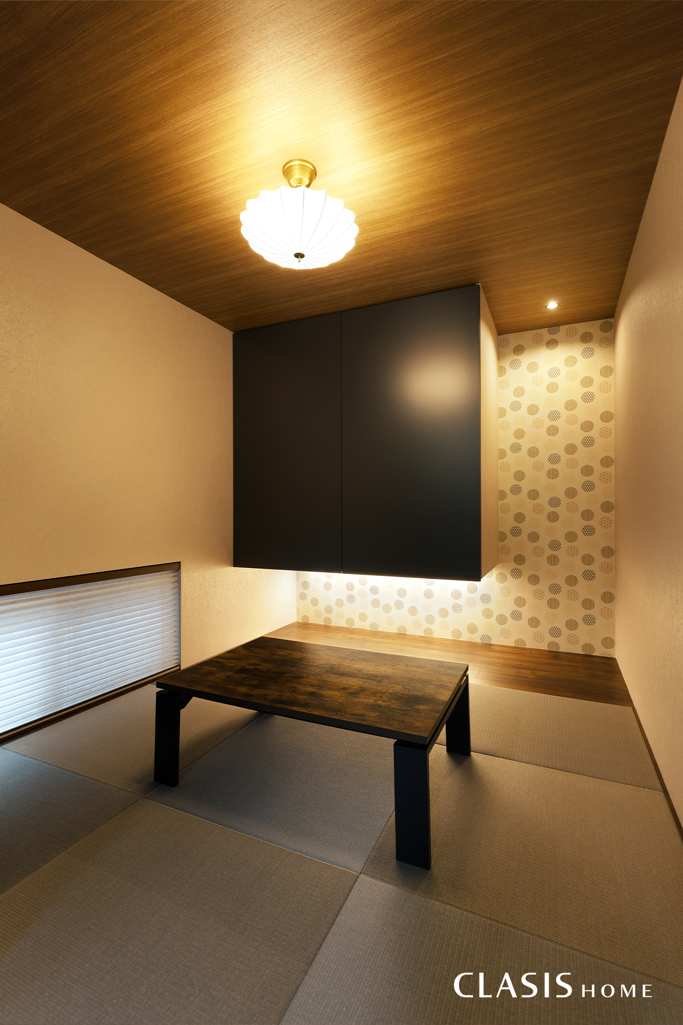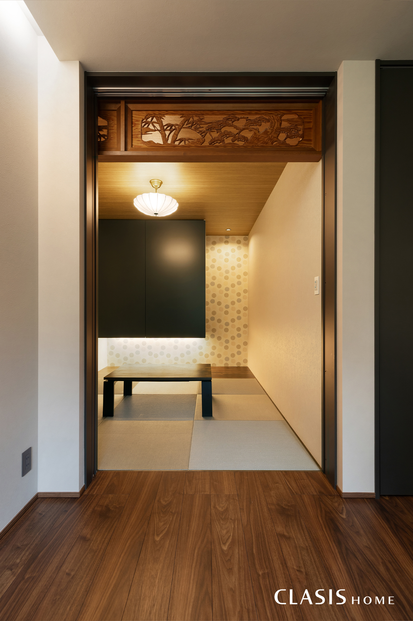 土地購入時にあった古家の欄間を加工して再利用した情緒あふれる和室。漆黒の建具でモダンに引き締めつつ、お施主様が選ばれた照明や壁紙がアクセントとなり、どこか可愛らしさも漂う特別な空間に仕上がっています。
