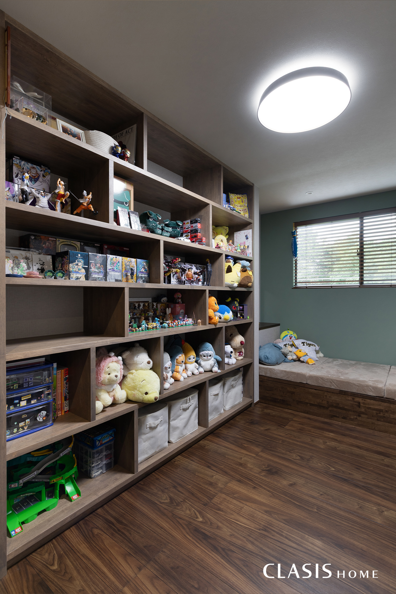 階段を上がると広がるのは、壁一面の本棚とヌックを設けた開放的なフリースペース。ご家族の「好き」を並べて楽しめるディスプレイ棚と、クッションに身を委ねて読書に没頭できるヌックが、日常に豊かな余白をもたらします。心ゆくまで趣味の時間を満喫できる、ご家族お気に入りの空間です。
