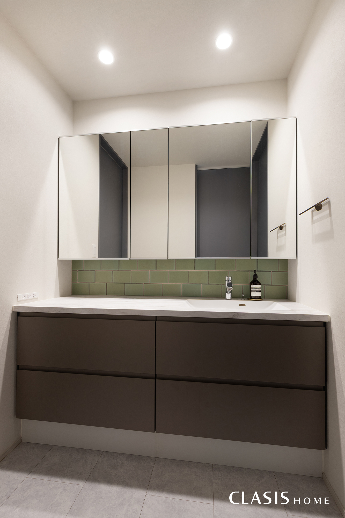お手入れのしやすい機能的な洗面台に、グリーンのタイルが個性を添える洗面室。しっとりとしたマットな質感のタイルと優しい光の反射が、清潔感の中に上品な彩りを与えてくれます。