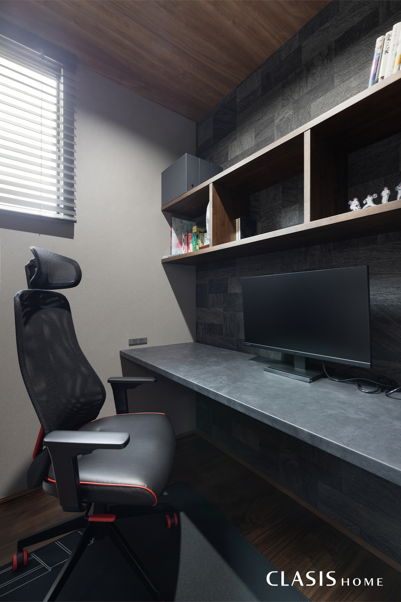 黒を基調としたモノトーンな設えが、静かな集中力を高めてくれるご主人様の書斎。空間に合わせた造作のカウンターデスクと棚は、使い勝手を追求した無駄のないレイアウトです。