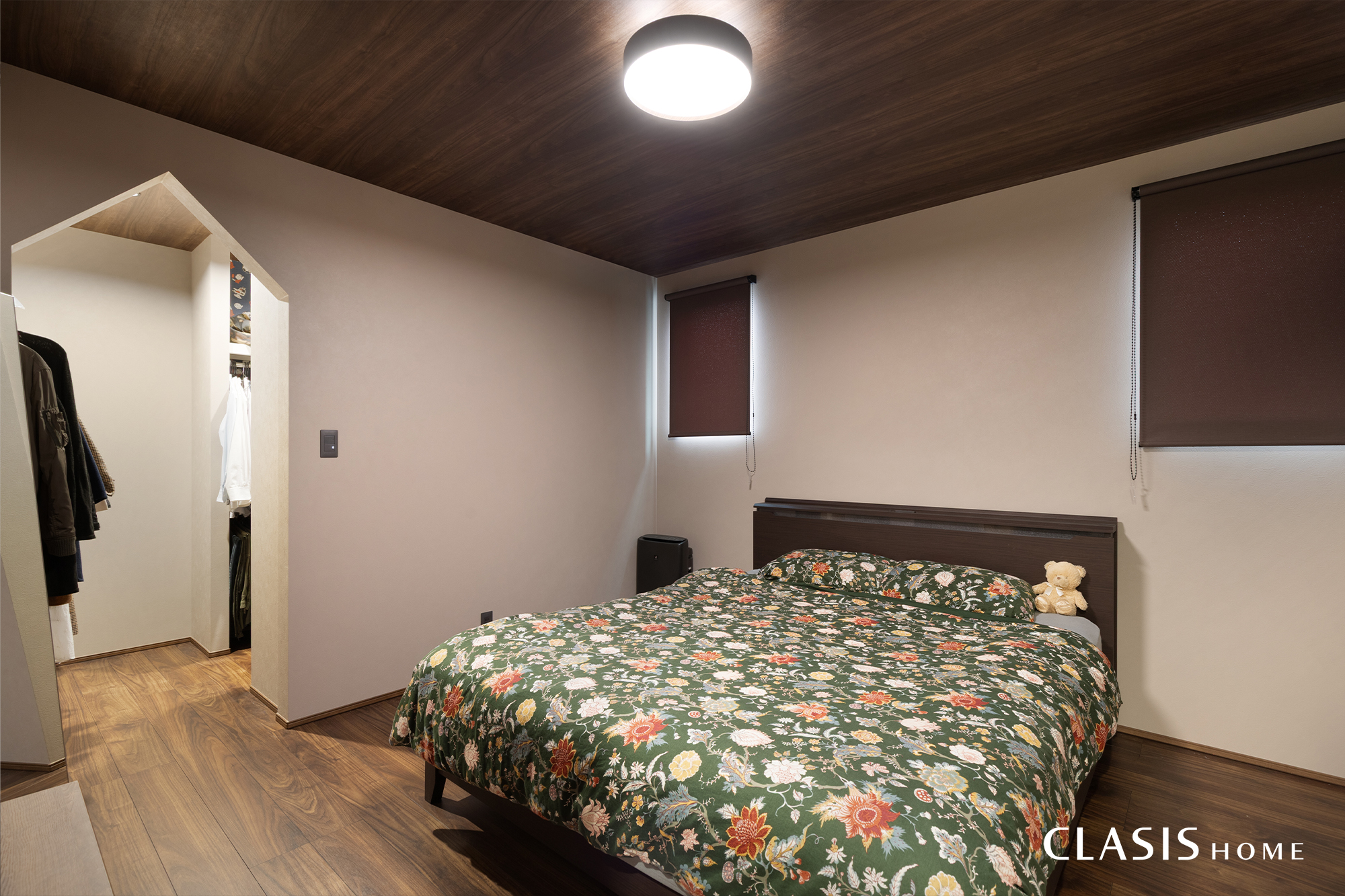 天井に木目をあしらい、全体を落ち着いたトーンで統一した寝室。心地よい眠りへと誘う穏やかな雰囲気に仕上げました。ウォークインクローゼットへの入り口には、三角の垂れ壁を採用してかわいらしさもプラスしています。