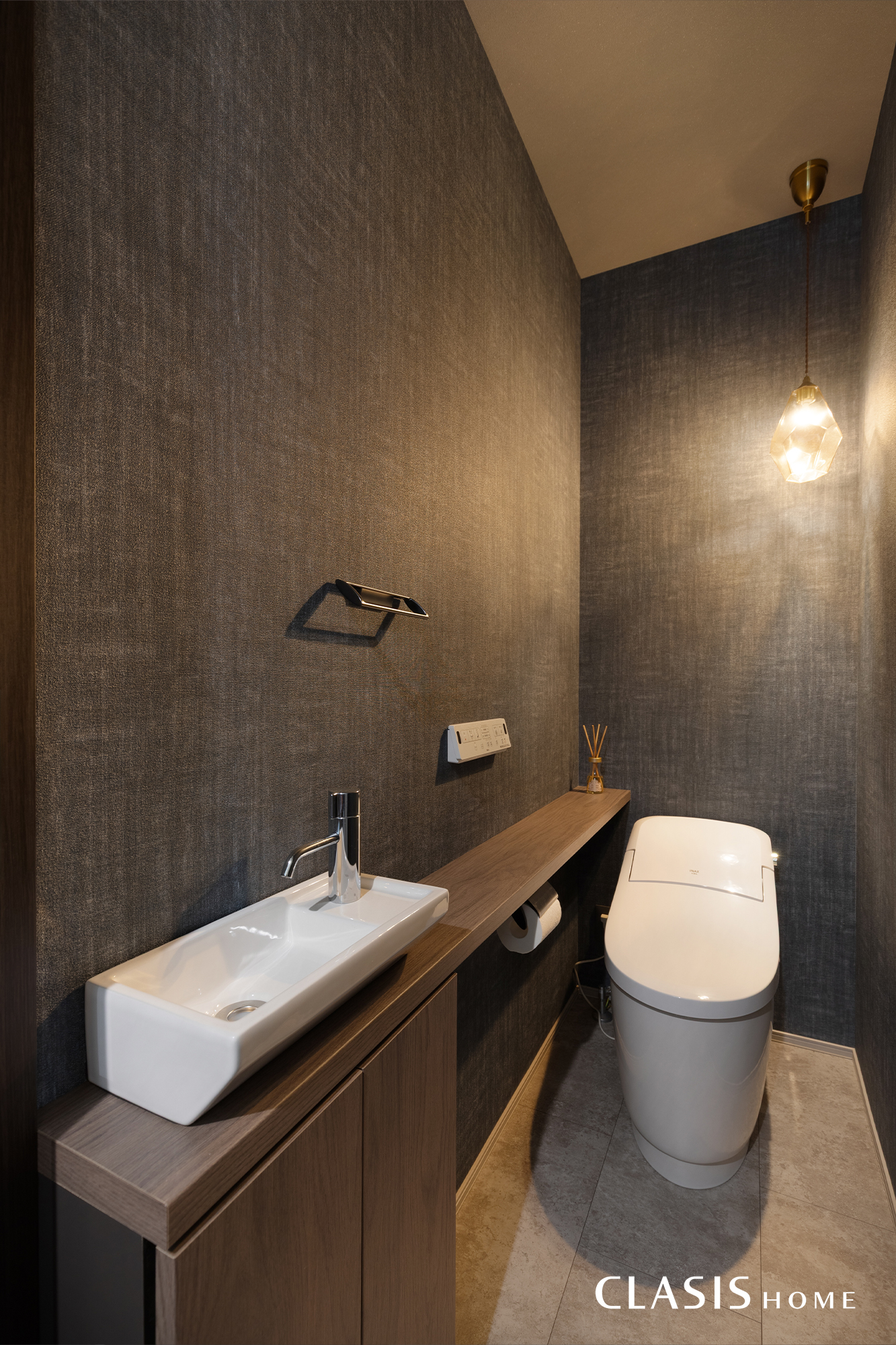 ダークトーンのクロスに繊細なペンダントライトが映える、落ち着きあるトイレ空間。限られたスペースながら、手洗い器と一体型のカウンター収納を設けることで、お掃除用品などをスマートに隠して美しさを保てるよう設計しました。