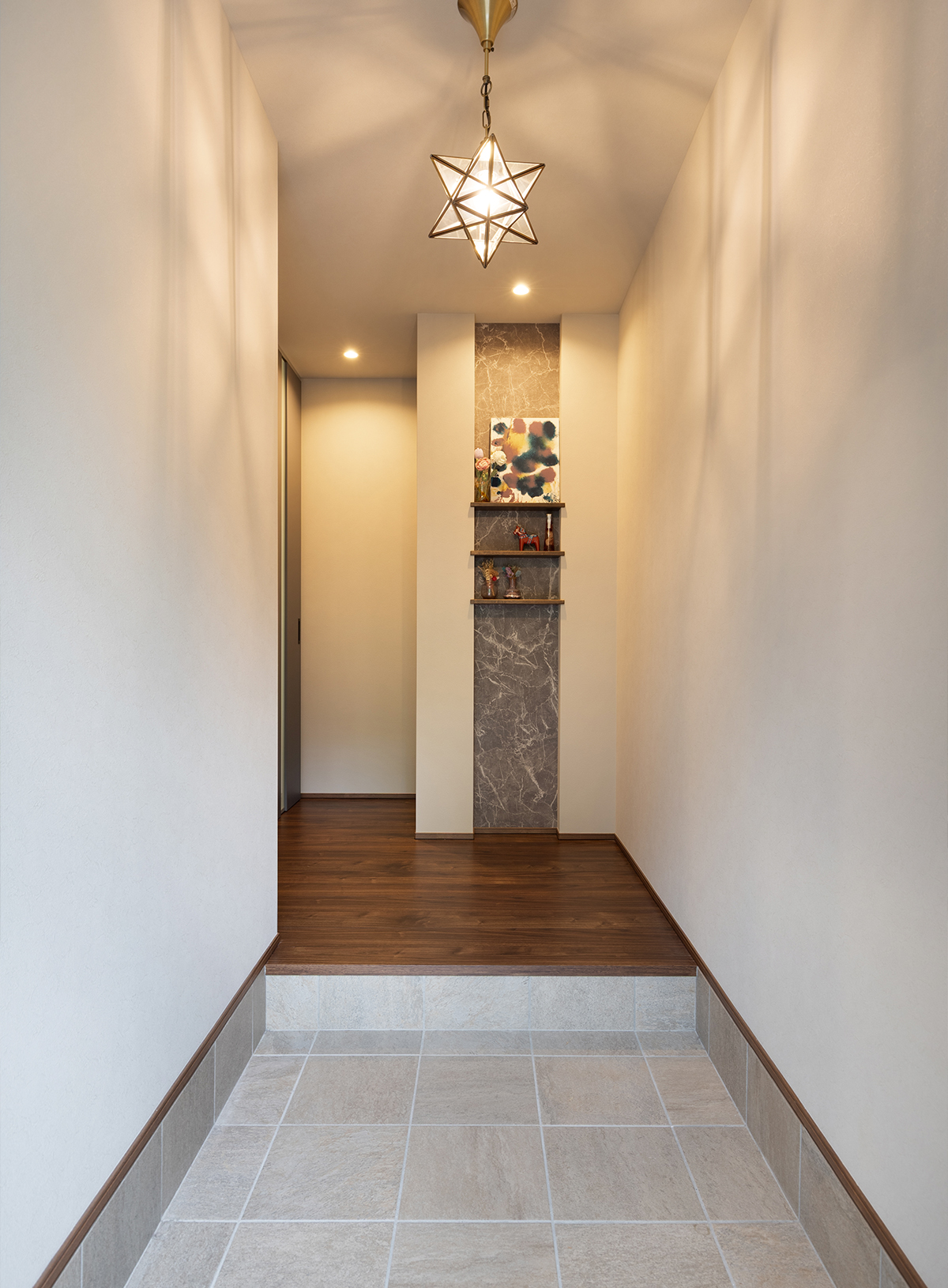 扉を開けた正面に設けたのは、石目調のアクセントクロスが映えるニッチスペース。思い出の品が並び、ご家族の温かさを感じられるスペースです。写真の画角よりも手前側ではシューズクロークを介してガレージとも土間続きで繋がっており、雨の日でも濡れることなく室内へ入れるような動線も確保しました。毎日の利便性と、暮らしを彩る意匠性を両立させた玄関周りです。