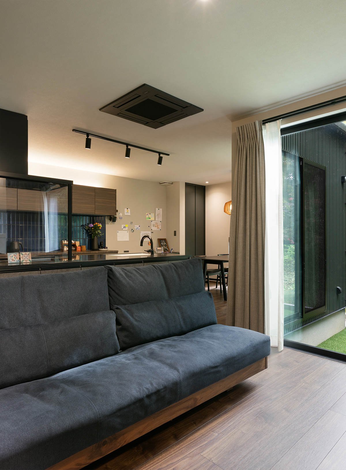 大人っぽいシックな色合いに、奥様お気に入りの濃紺タイルが艶やかな彩りを添えるキッチン。マグネット対応の壁面にはお子様の作品を飾ることができ、洗練された大人の空間の中に家族の日常が溶け込む、温かなコーナーとなりました。
