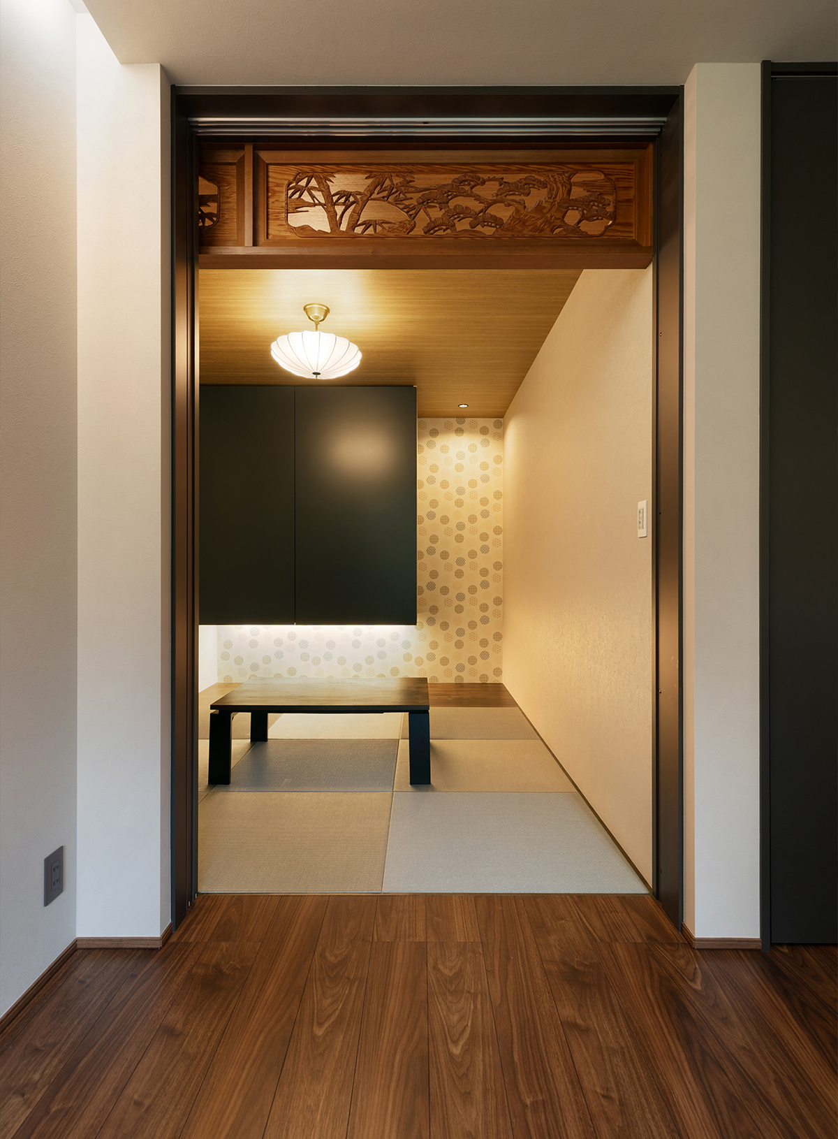 土地購入時にあった古家の欄間を加工して再利用した情緒あふれる和室。漆黒の建具でモダンに引き締めつつ、お施主様が選ばれた照明や壁紙がアクセントとなり、どこか可愛らしさも漂う特別な空間に仕上がっています。