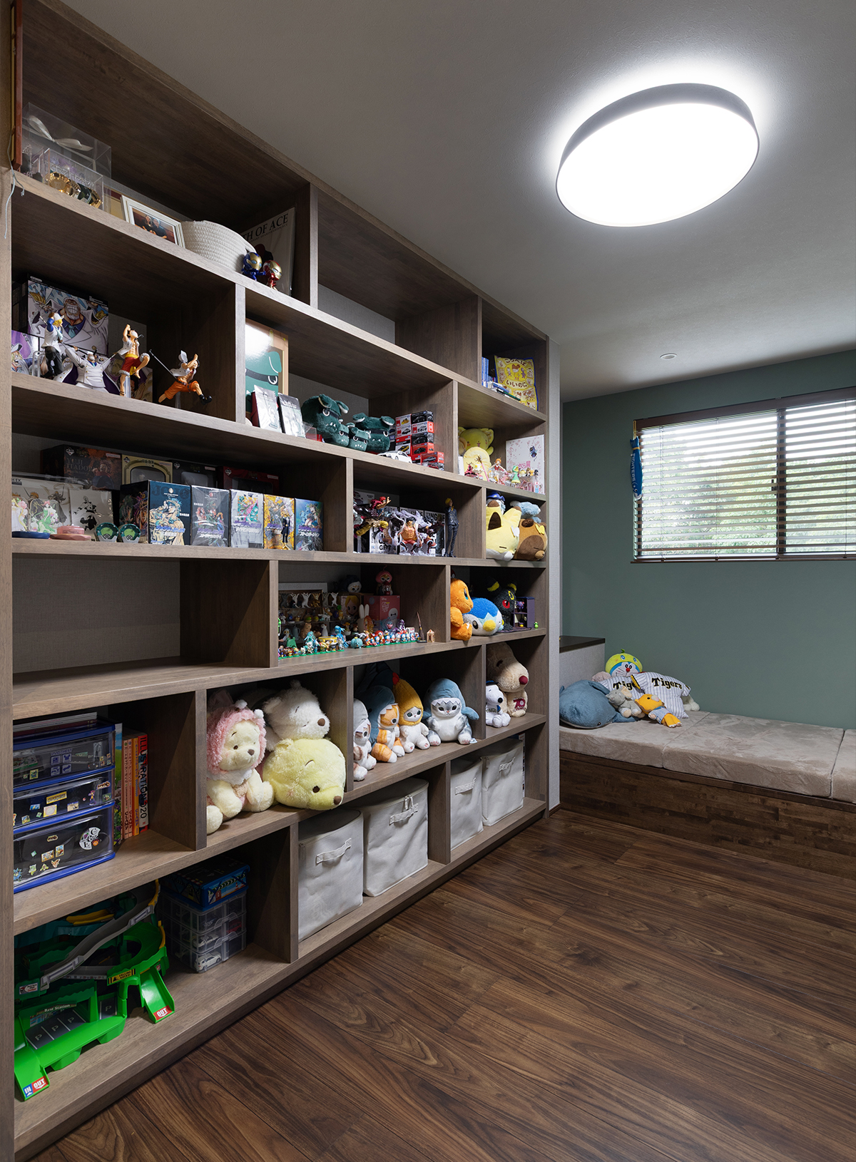 階段を上がると広がるのは、壁一面の本棚とヌックを設けた開放的なフリースペース。ご家族の「好き」を並べて楽しめるディスプレイ棚と、クッションに身を委ねて読書に没頭できるヌックが、日常に豊かな余白をもたらします。心ゆくまで趣味の時間を満喫できる、ご家族お気に入りの空間です。