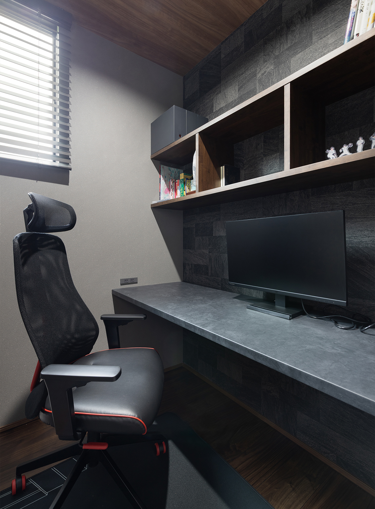 黒を基調としたモノトーンな設えが、静かな集中力を高めてくれるご主人様の書斎。空間に合わせた造作のカウンターデスクと棚は、使い勝手を追求した無駄のないレイアウトです。
