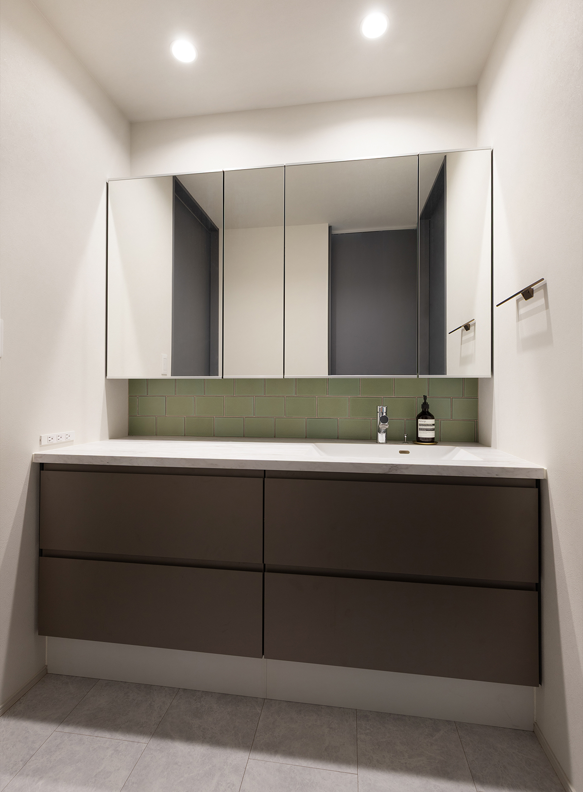 お手入れのしやすい機能的な洗面台に、グリーンのタイルが個性を添える洗面室。しっとりとしたマットな質感のタイルと優しい光の反射が、清潔感の中に上品な彩りを与えてくれます。