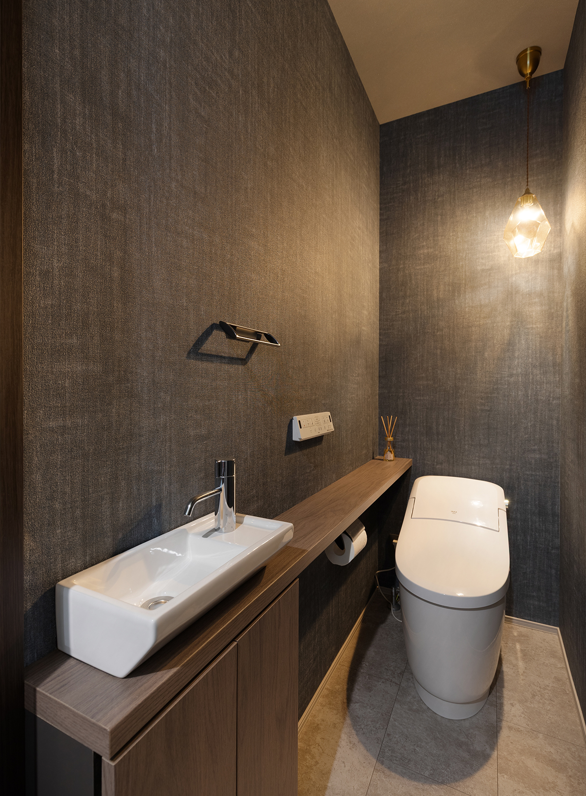 ダークトーンのクロスに繊細なペンダントライトが映える、落ち着きあるトイレ空間。限られたスペースながら、手洗い器と一体型のカウンター収納を設けることで、お掃除用品などをスマートに隠して美しさを保てるよう設計しました。