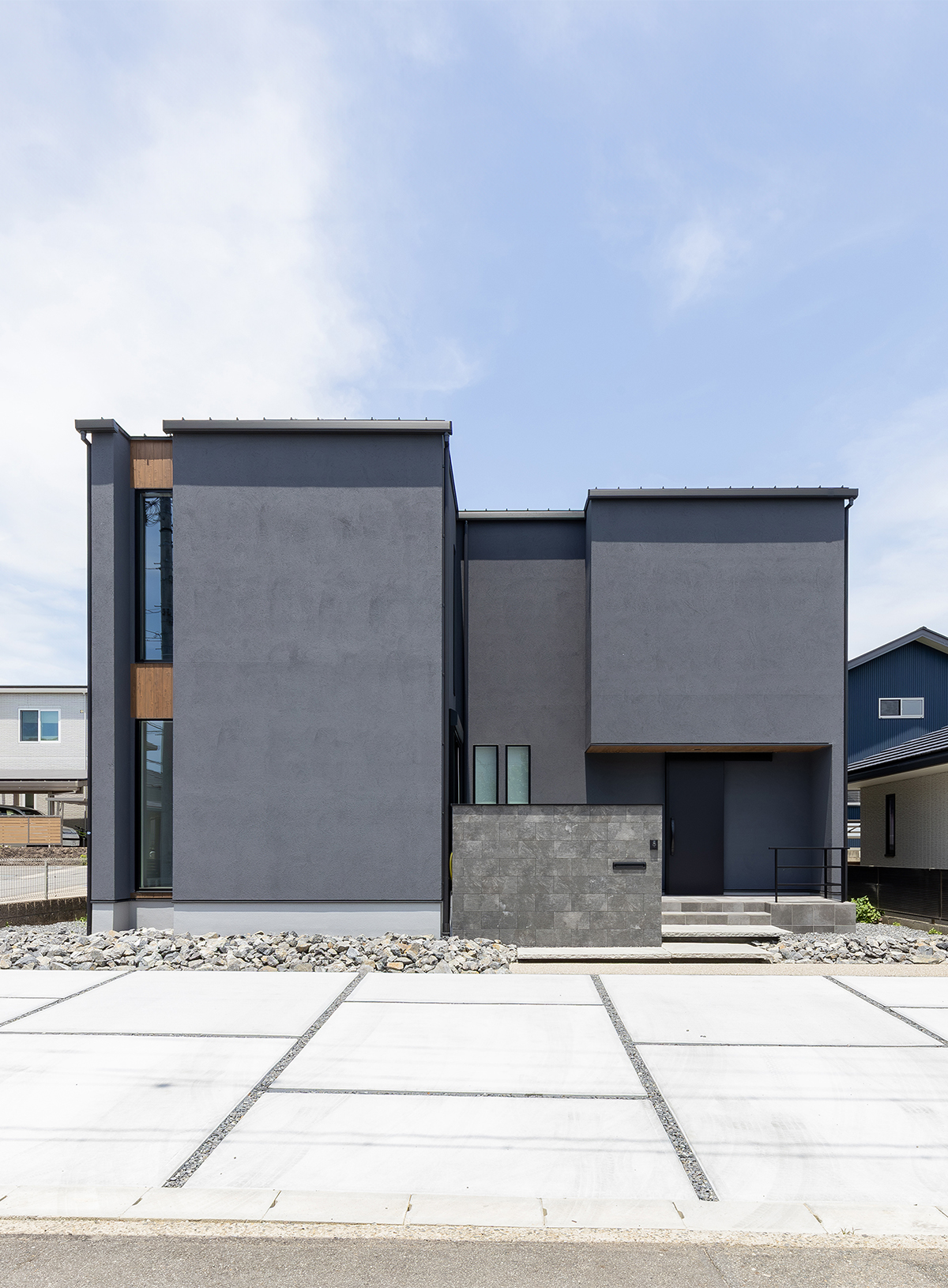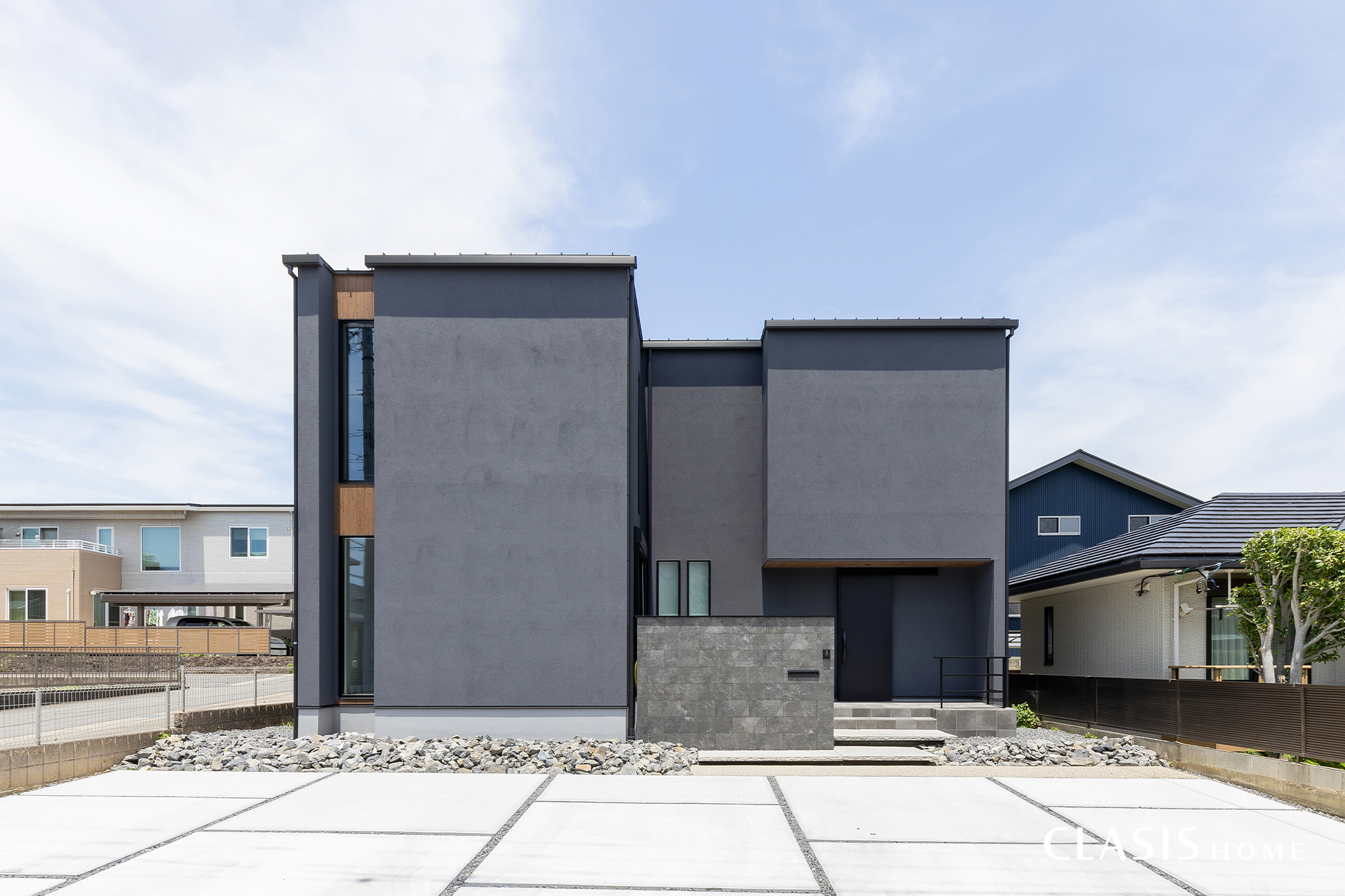 黒の塗り壁をメインに木目をアクセントに利用した重厚感のあるファサード。南側道路のため、スリット窓などを中心にプライバシーを確保しつつも優しく光が入るような採光設計になっています。