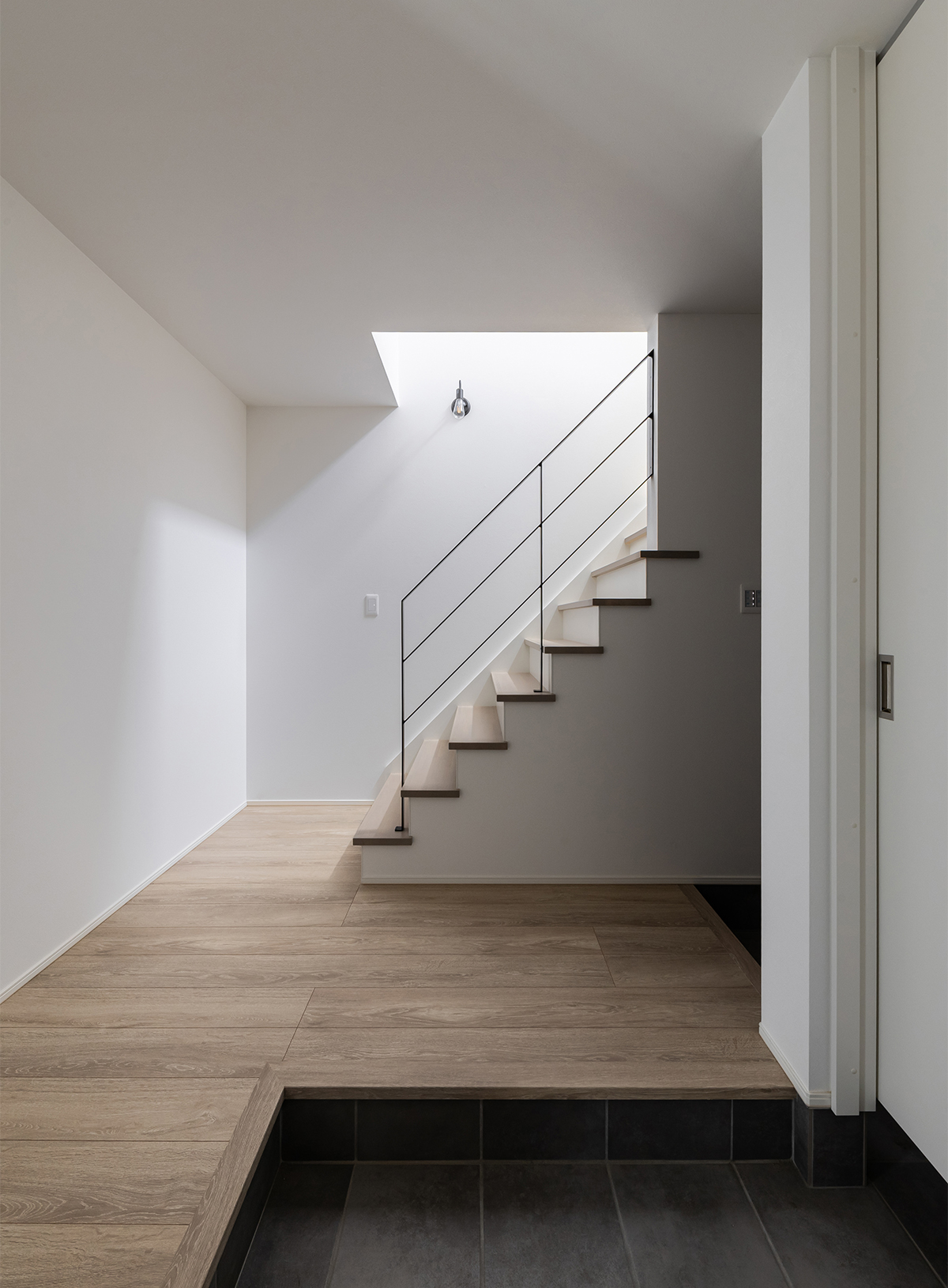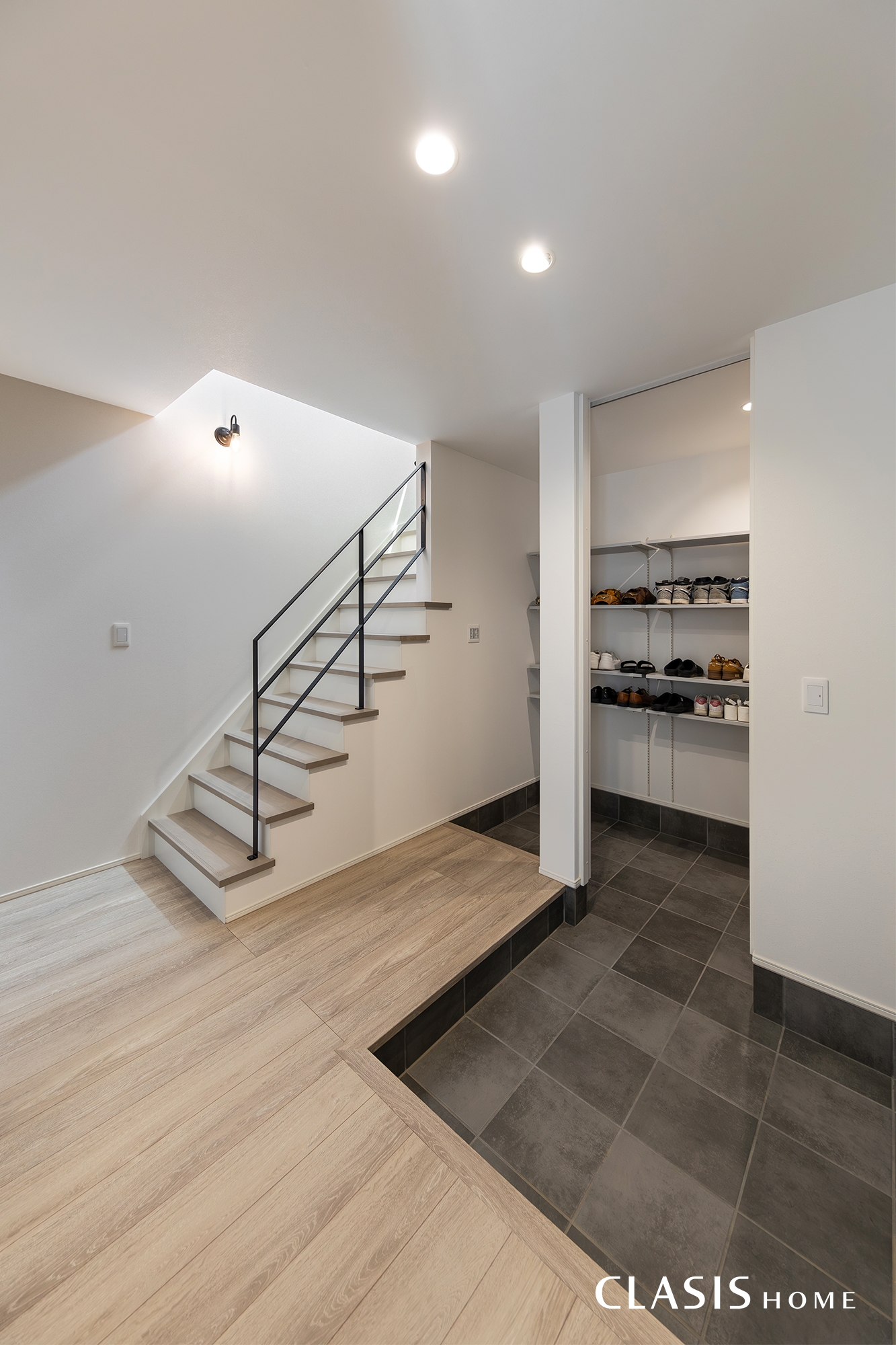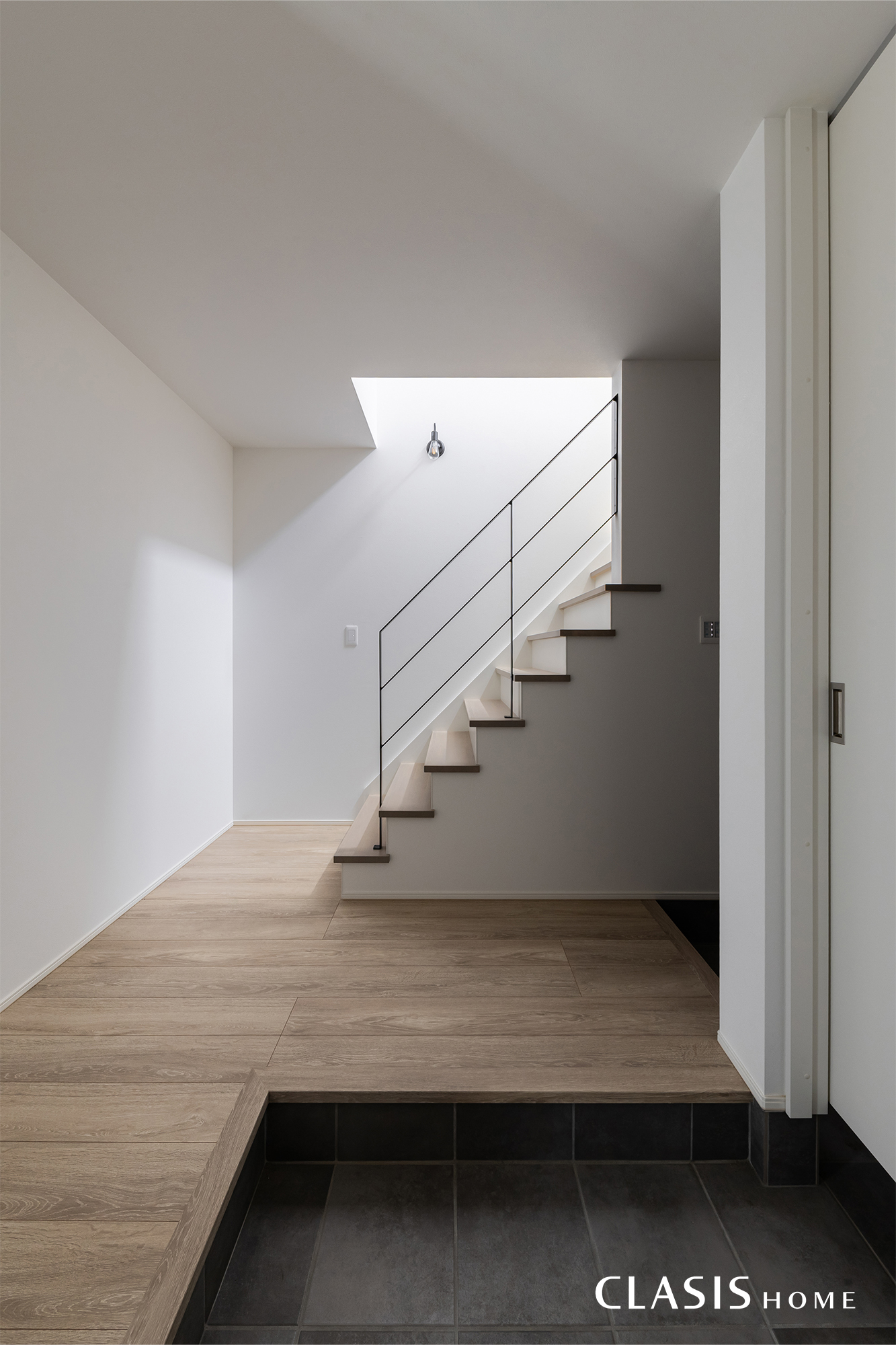 玄関入ってすぐ階段が目に入るので、照明と鉄骨手すりをアクセントにしながらも、すっきりした空間に仕上げました。サイドには使い勝手の良いSCLも用意されています。