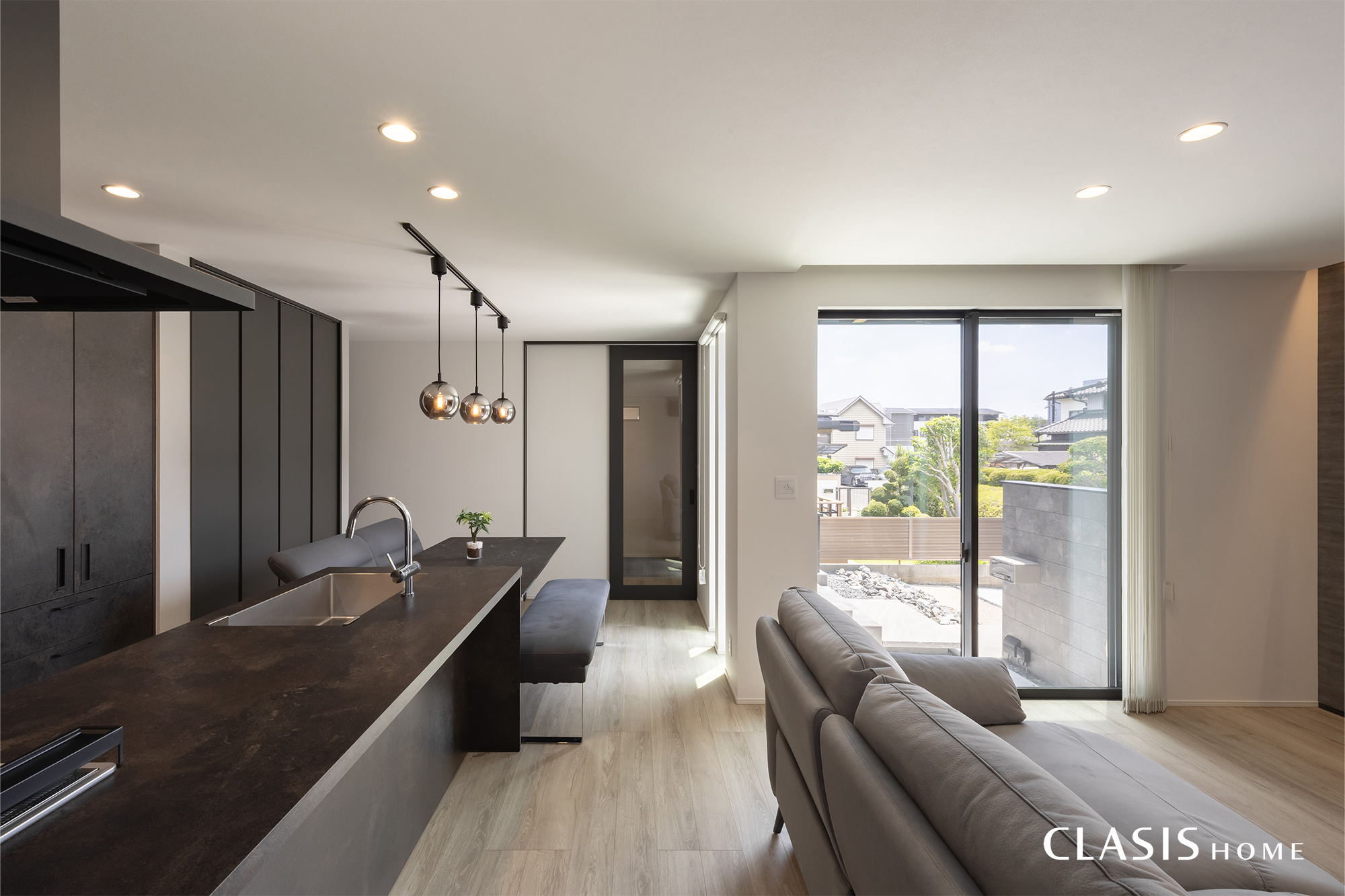 南側正面に窓がほとんどない外観からは想像できないほど、明るく開放的なLDK。L字型の配置でキッチンやダイニングにもしっかり陽が射し込みます。