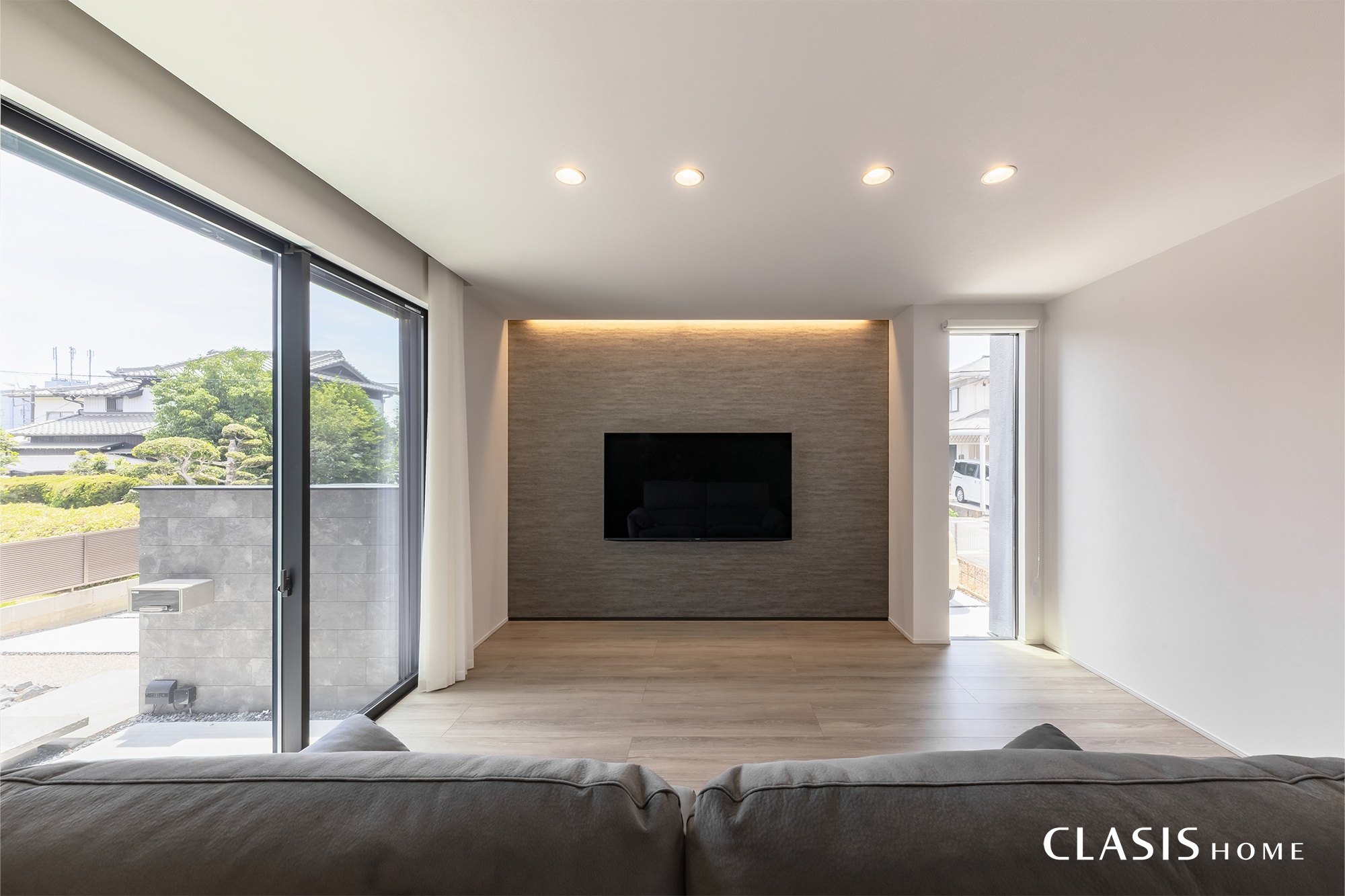 「シンプルなホテルライクスタイルでもカッコ良すぎないリビング」をコンセプトに、床は木目で全体的に明るい雰囲気に仕上げました。日当たりがよく日中は照明がいらないくらい明るいため、テレビ面に間接照明を付けることで、朝と夜に異なる雰囲気を楽しめるような照明計画にしています。