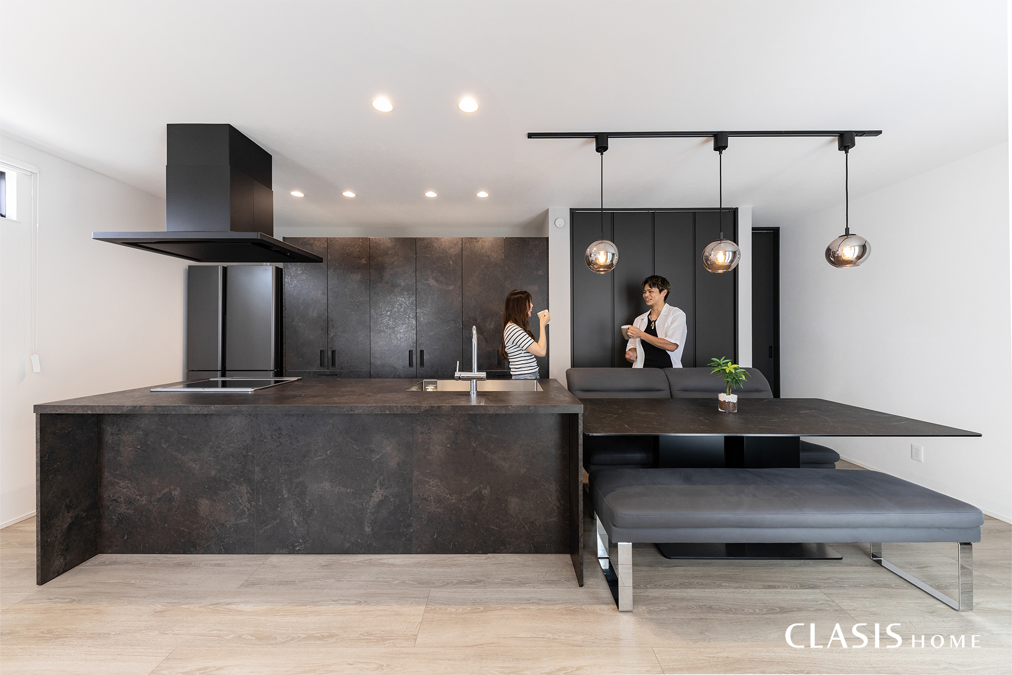 こだわりのキッチンは背面の収納まで統一感とこだわりをもって仕様を決めました。無駄なものは置かずに必要最低限に拘り、ホテルライクかつ広々とした空間に見えるように意識しています。