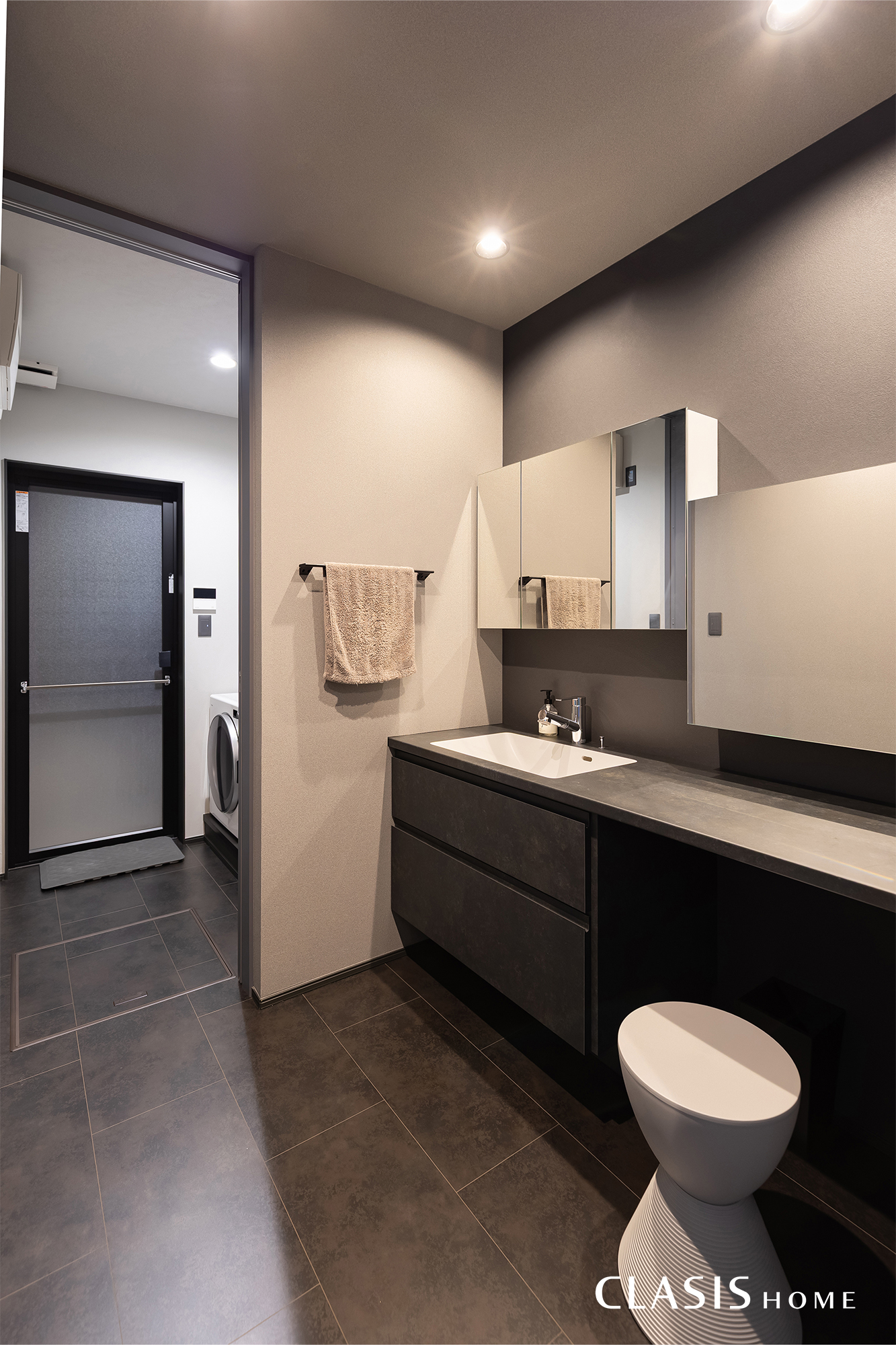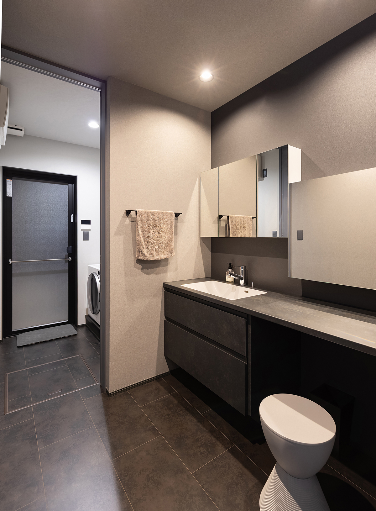 洗面はLDKよりもホテルライク感を高めて、より落ち着いた雰囲気に。右側のミラーを一段低い高さに配置することで、座った時にちょうどいい高さになるようにしています。