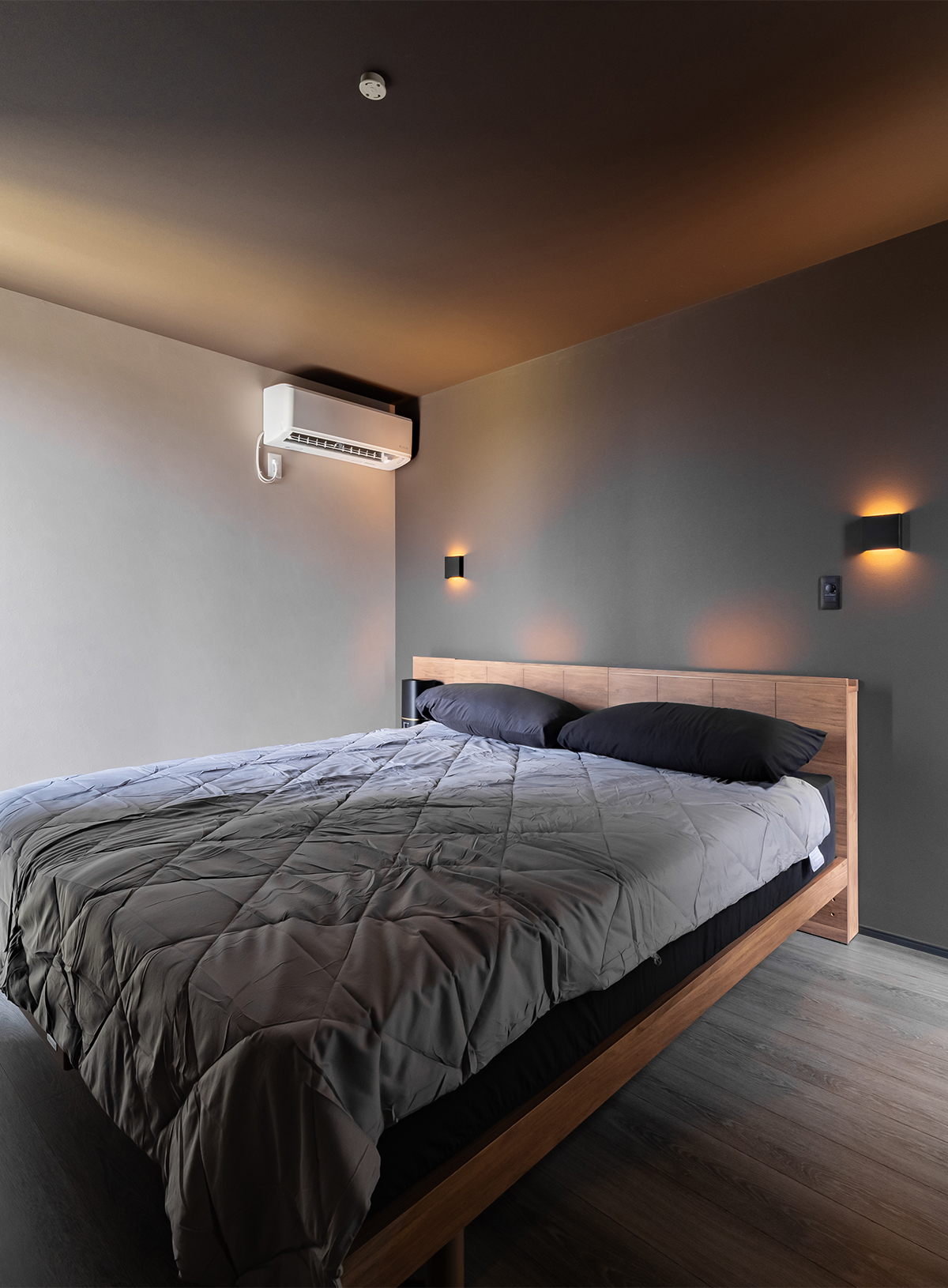寝室は照明の間接光とダークなクロスを採用し、落ち着いた雰囲気に仕上げています。