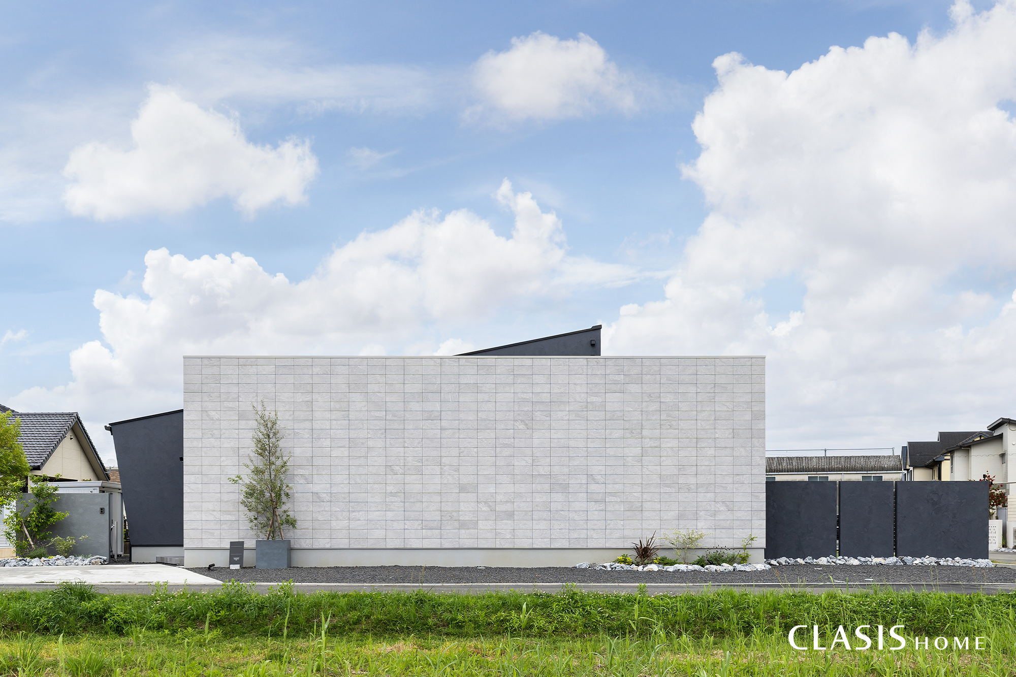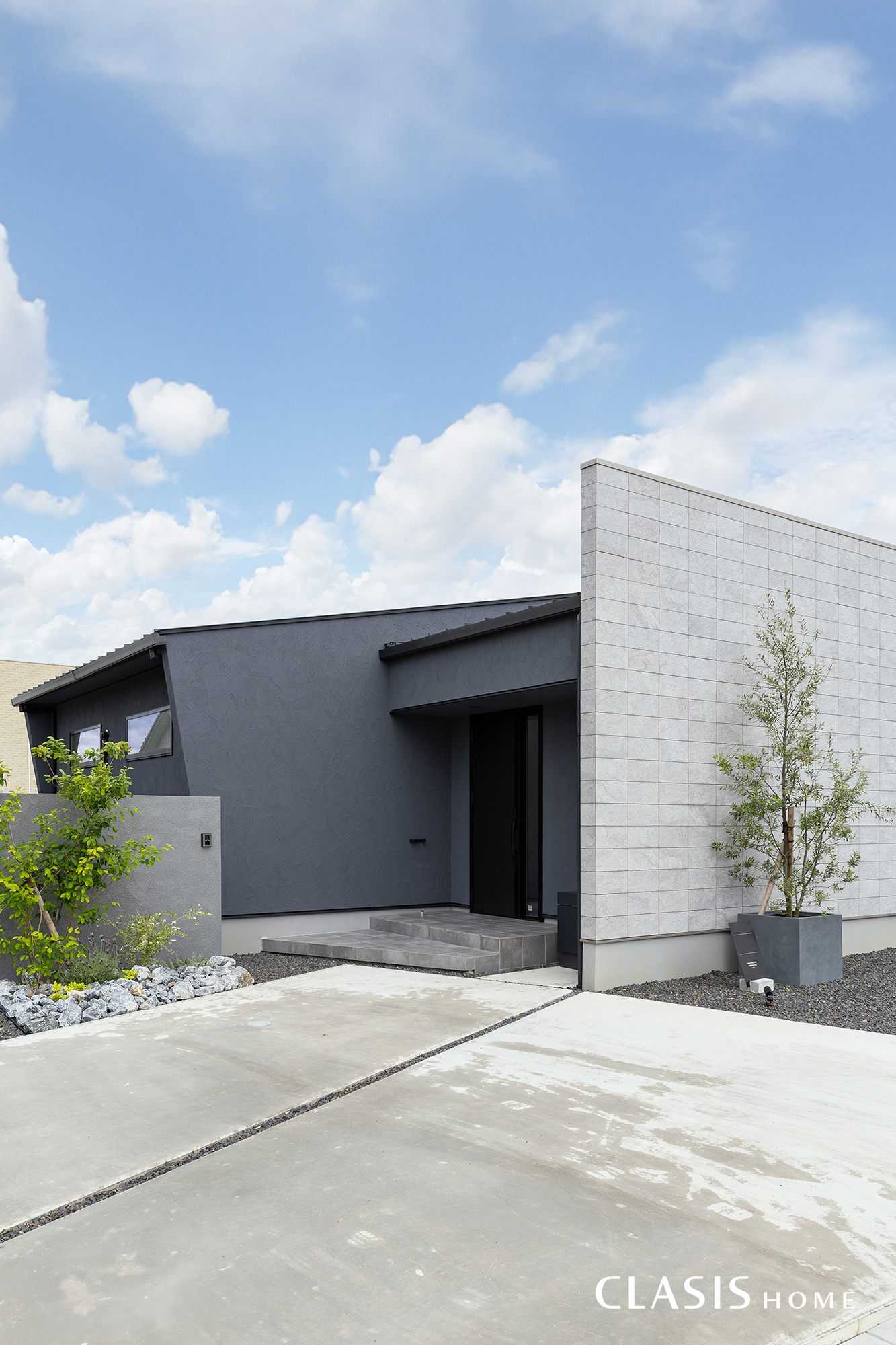 ネイビーの塗り壁をベースに、正面にライトグレーのアクセントタイルでインパクトを持たせた平屋のファサード。直線と斜線が組み合わさったデザインに無機質な素材を採用することで、従来の住まいのイメージを刷新する外観としました。