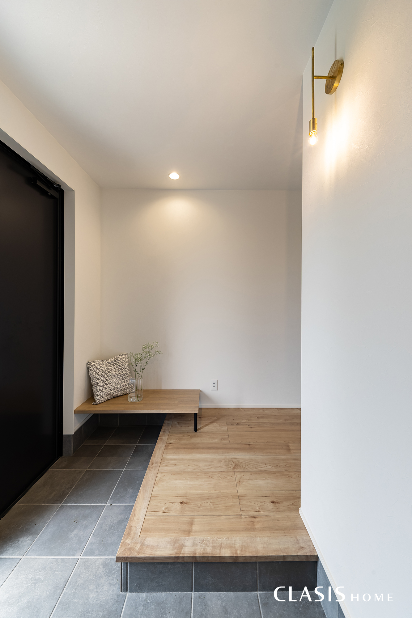 玄関ホールにはシューズクローゼットと造作ベンチを設けました。造作のベンチの脚はアイアンで製作してスッキリしたデザインに。ブラックの差し色が空間を引き締めるアクセントです。